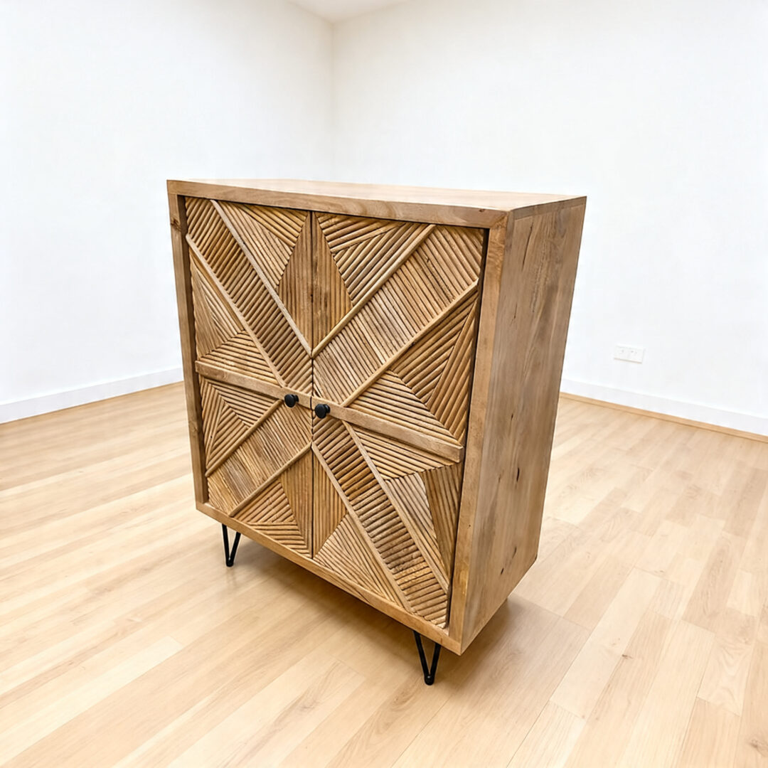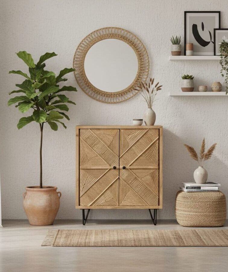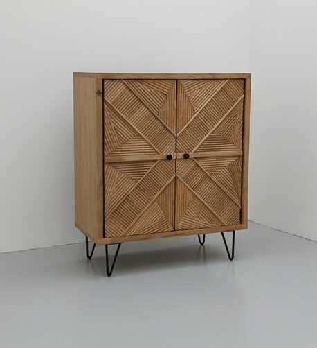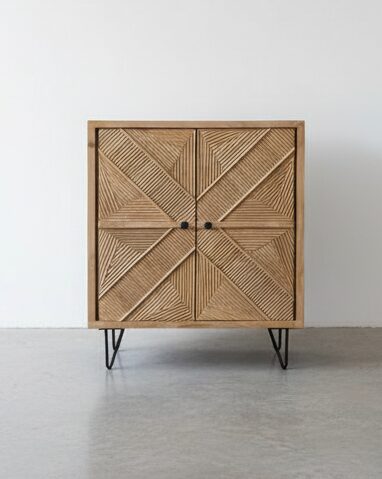 Il cuore estetico della credenza risiede nelle due ante frontali, magistralmente lavorate a mano per creare una texture materica che invita al tatto e cattura lo sguardo. All’interno, lo spazio è organizzato in modo razionale grazie a una solida mensola che divide il vano, offrendo una capacità contenitiva ideale per riporre con ordine stoviglie, biancheria o oggetti personali. Grazie al suo design intramontabile e alla nobiltà del legno massello, questo mobile si inserisce armoniosamente in ambienti che spaziano dal gusto etnico-chic al moderno naturale, portando in casa il fascino esclusivo di un manufatto creato con passione e maestria manuale