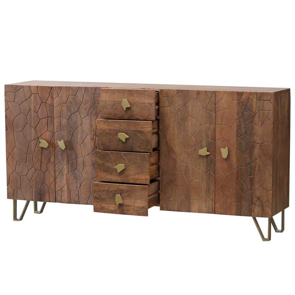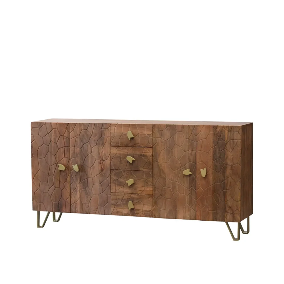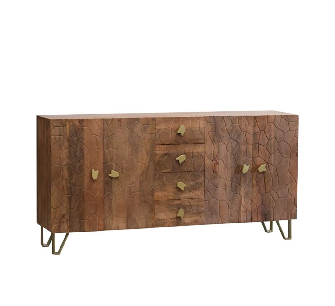 Questa splendida credenza in legno massello rappresenta l’unione perfetta tra l’alto artigianato etnico e il design contemporaneo più ricercato, ideale per chi desidera un pezzo d’arredamento che sia al tempo stesso una scultura decorativa e una soluzione funzionale. La struttura, interamente realizzata e lavorata a mano, celebra la forza materica del legno vivo, esaltandone le venature naturali e la solidità costruttiva.. Il vero protagonista del mobile è il fronte delle quattro ante, caratterizzato da un motivo geometrico estremamente particolare e complesso, dove rilievi e intagli creano un dinamico gioco di luci e ombre che conferisce profondità e un carattere inimitabile a tutta la zona living.