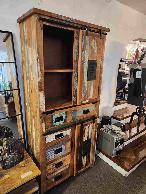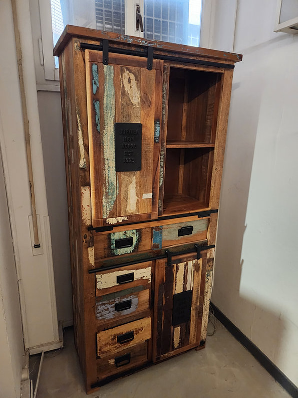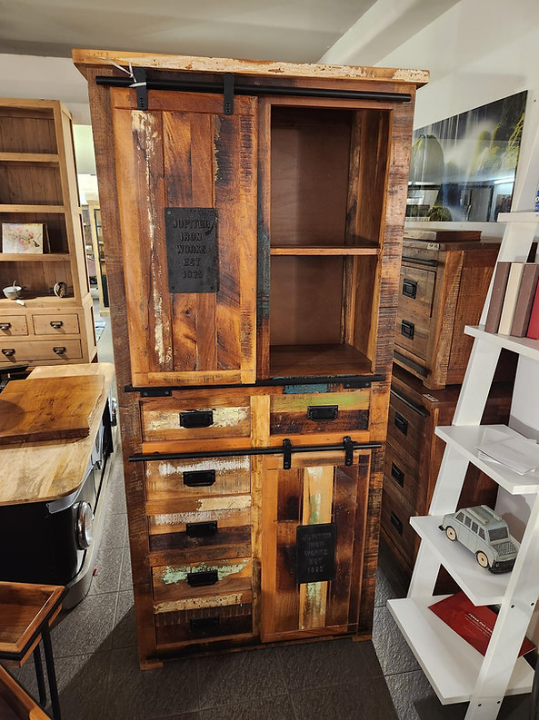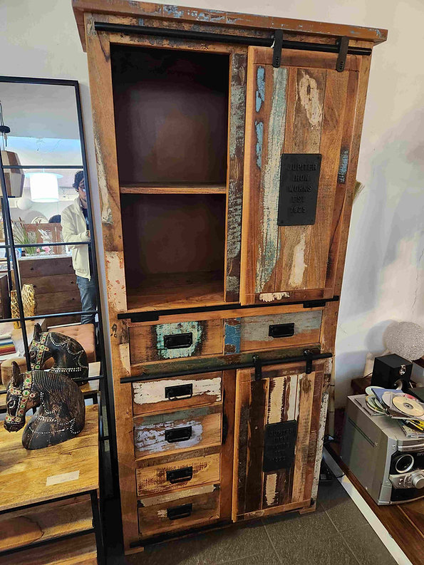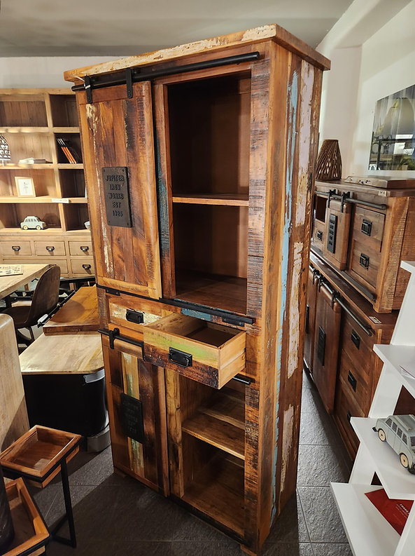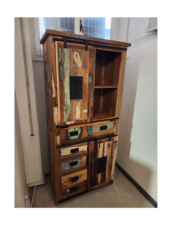 Madia Dispensa Jupiter Riciclo, realizzata in legno massello riciclato colorata con dettagli in ferro e ghisa