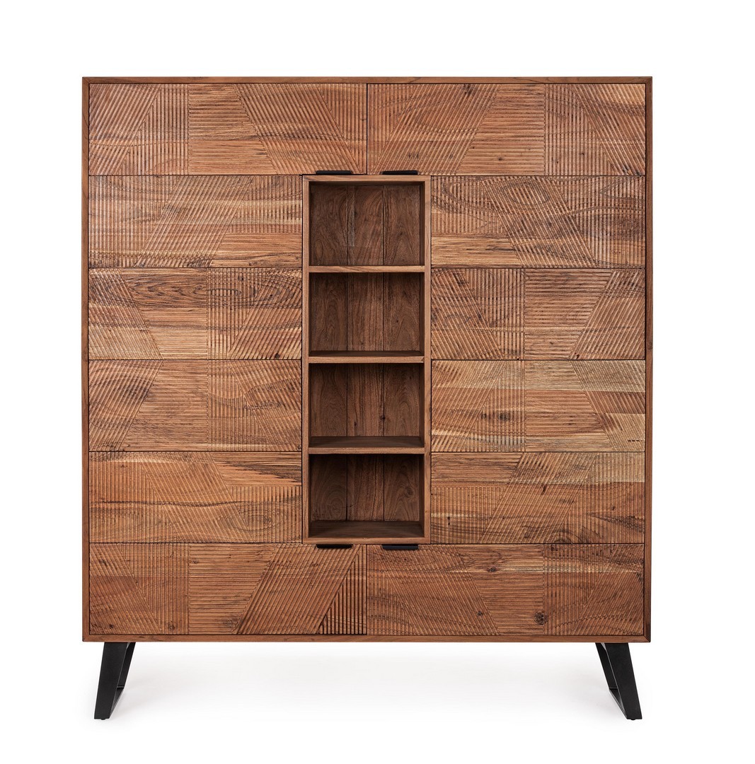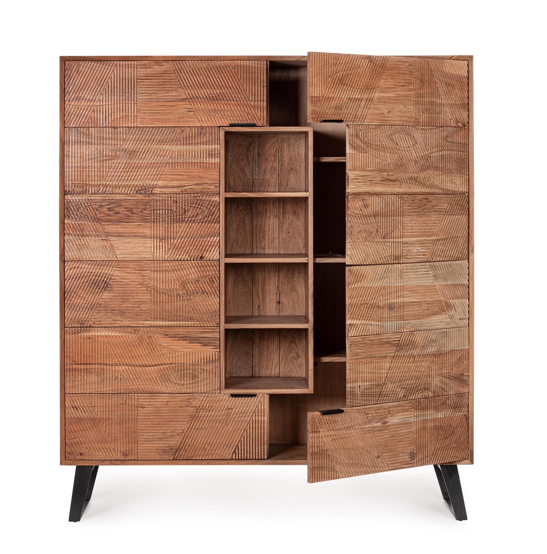 Mobile 4A-3P Isar, spettacolare mobile in legno massello di acacia. Composto da 4 ante in legno e ripiani a vista nella parte centrale. Il frontale di questo mobile è tutto intarsiato a mano. Finitura acrilica protettiva. Maniglie in metallo.