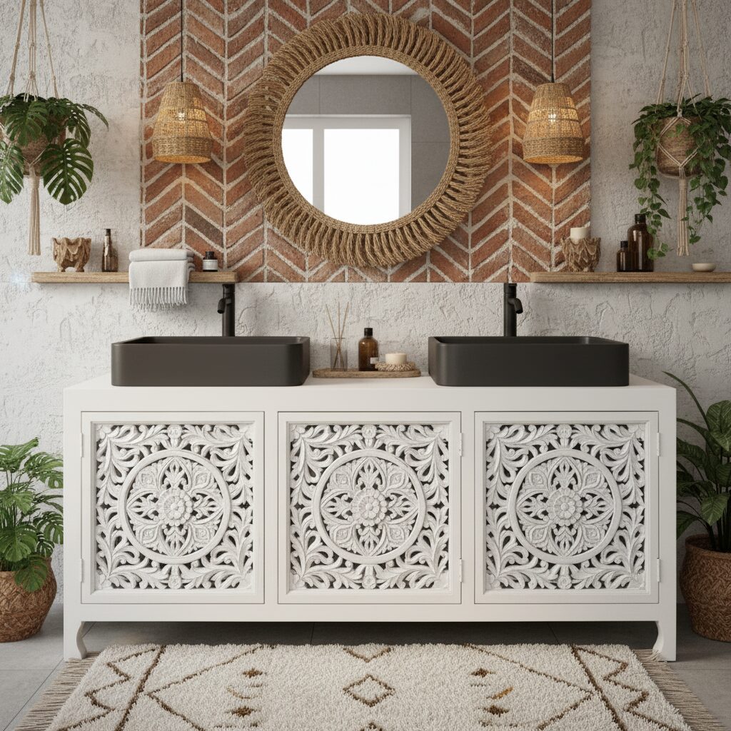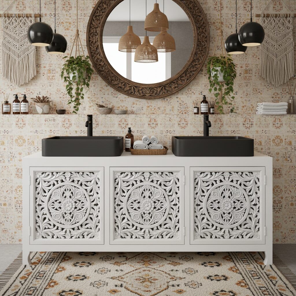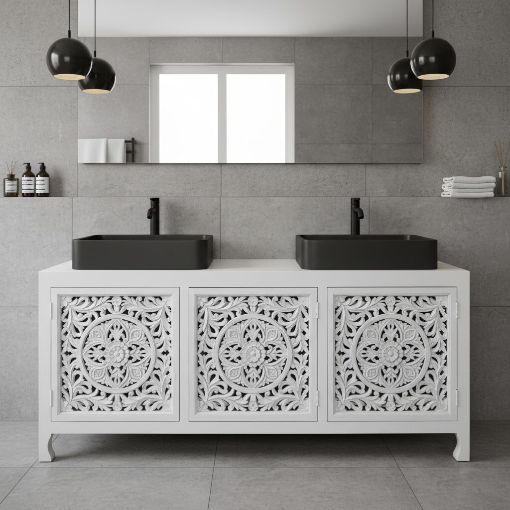 Mobile Bagno Oriente 4 White realizzato artigianalmente con acacia massello finitura white . Se vuoi un pezzo veramente particolare per arredare i tuoi ambienti l’hai trovato. Le decorazione sulle ante sono intagliate finemente a mano con motivi floreali. Pezzo originale che saprà dare carattere alla zona bagno ,TUTTO IN LEGNO MASSELLO