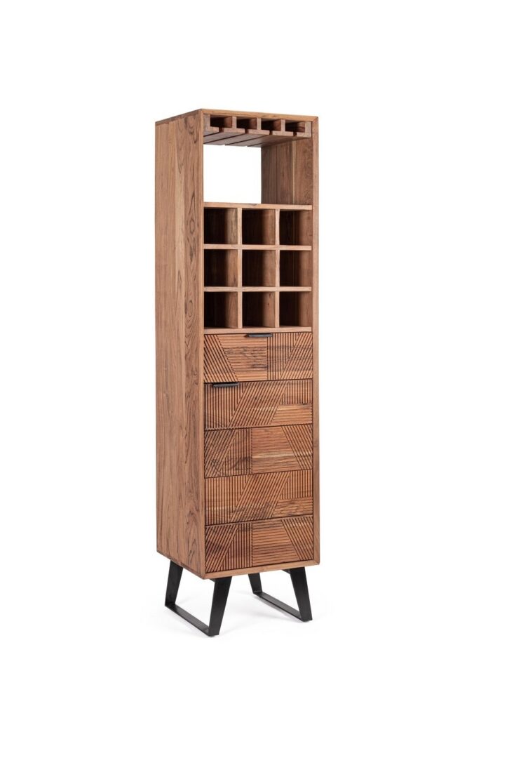 Mobile Bar Isar 1A-1C, spettacolare mobile bar in legno massello di acacia. Composto da 1 anta e 1 cassetto.. Il frontale di questo mobile è tutto intarsiato a mano. Finitura acrilica protettiva. Maniglie in metallo.