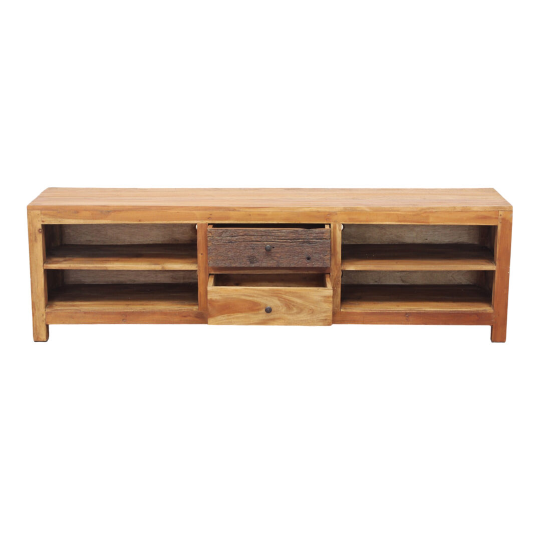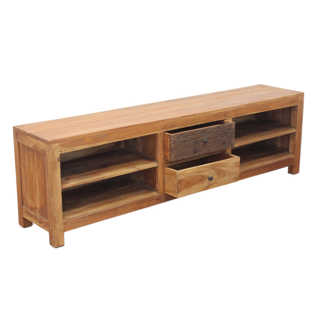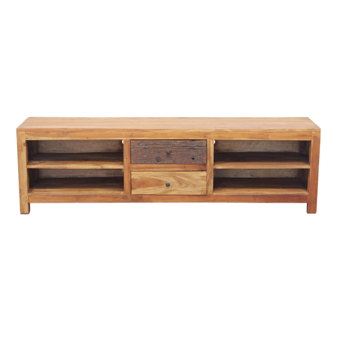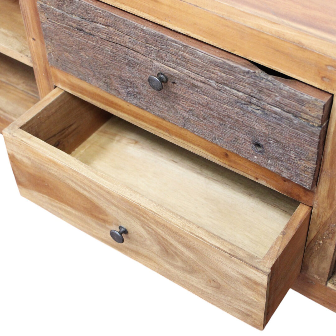 Progettato per offrire praticità e stile, il mobile è dotato di due cassetti centrali e quattro vani a giorno, ideali per organizzare dispositivi elettronici, libri o oggetti decorativi. I fori passacavi integrati consentono di gestire i cavi in modo discreto, mantenendo un aspetto ordinato ed elegante.