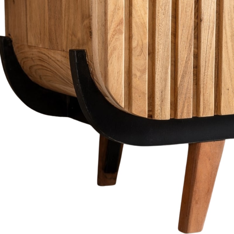 Questo mobile porta TV in legno massello rappresenta un’evoluzione sofisticata dell’arredamento etnico-contemporaneo, dove la robustezza della lavorazione artigianale incontra un design grafico e di carattere. La struttura, interamente realizzata e rifinita a mano, celebra l’autenticità del legno vivo, esaltandone le venature naturali e le piccole irregolarità che rendono ogni pezzo un’opera unica. Il contrasto cromatico tra l’essenza del legno e gli inserti in colore nero definisce i volumi del mobile con eleganza, conferendogli un aspetto moderno e grintoso che si inserisce perfettamente in zone living dal gusto industriale o coloniale.
