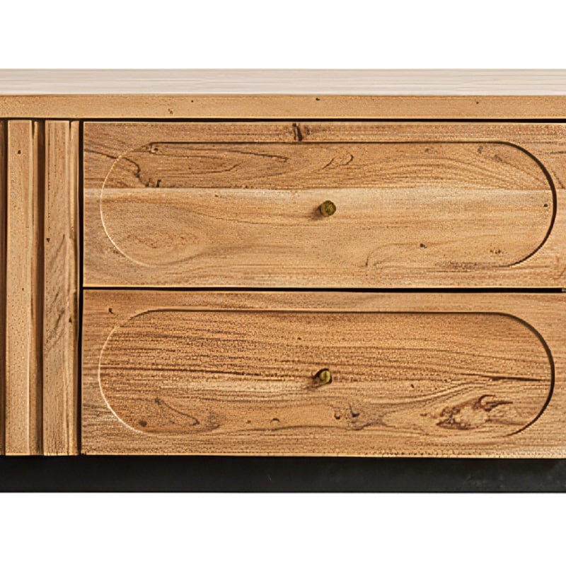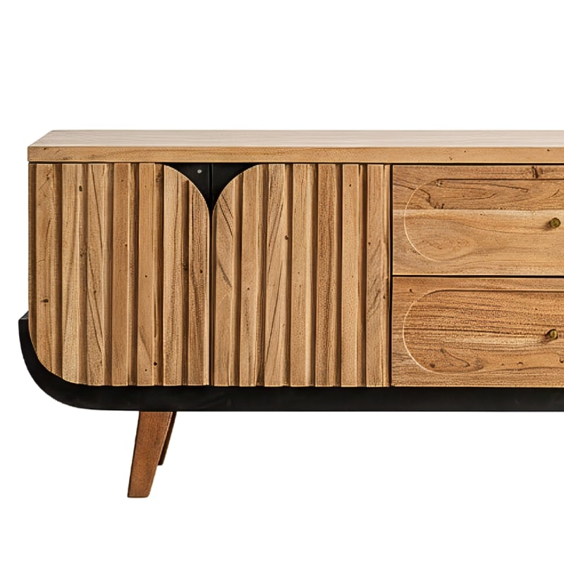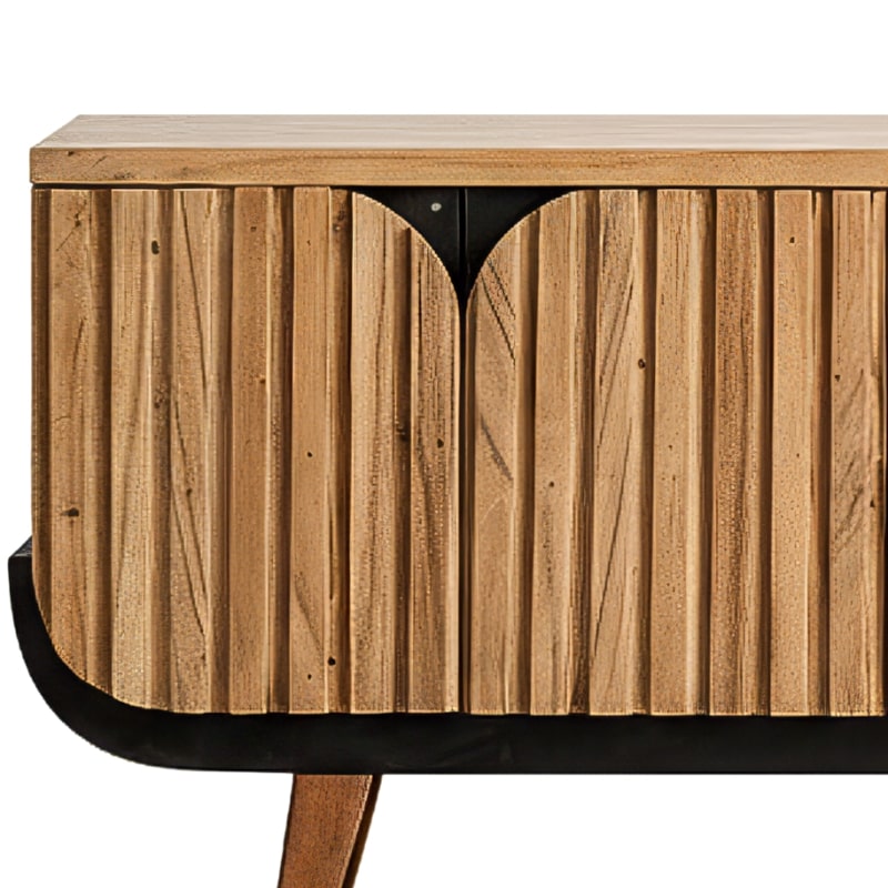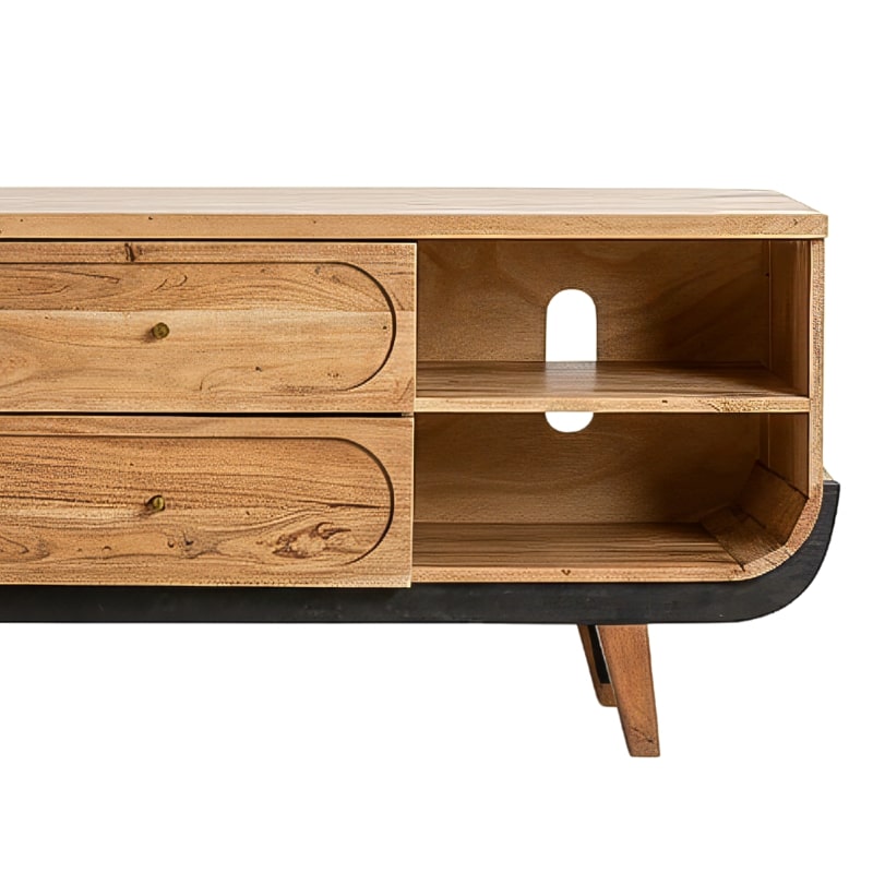La gestione degli spazi è progettata per offrire la massima funzionalità multimediale senza rinunciare all’estetica: ai lati troviamo due ante che celano capienti vani per proteggere gli accessori più ingombranti, affiancate da due ripiani a giorno ideali per esporre oggetti decorativi o per un rapido accesso a dispositivi elettronici. Al centro, due pratici cassetti rifiniti con cura completano la capacità contenitiva, permettendo di organizzare con ordine telecomandi e cavetteria. La solidità del legno massello garantisce un supporto sicuro per ogni tipo di schermo, mentre i dettagli neri sapientemente distribuiti elevano il porta TV a vero e proprio pezzo di design capace di donare personalità e una profondità inaspettata a tutto l’ambiente circostante.