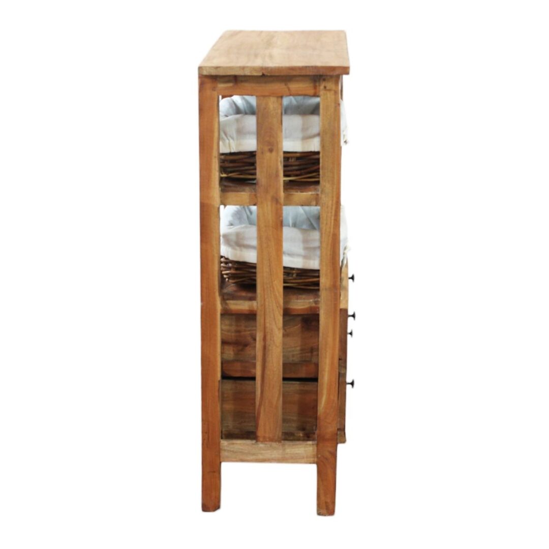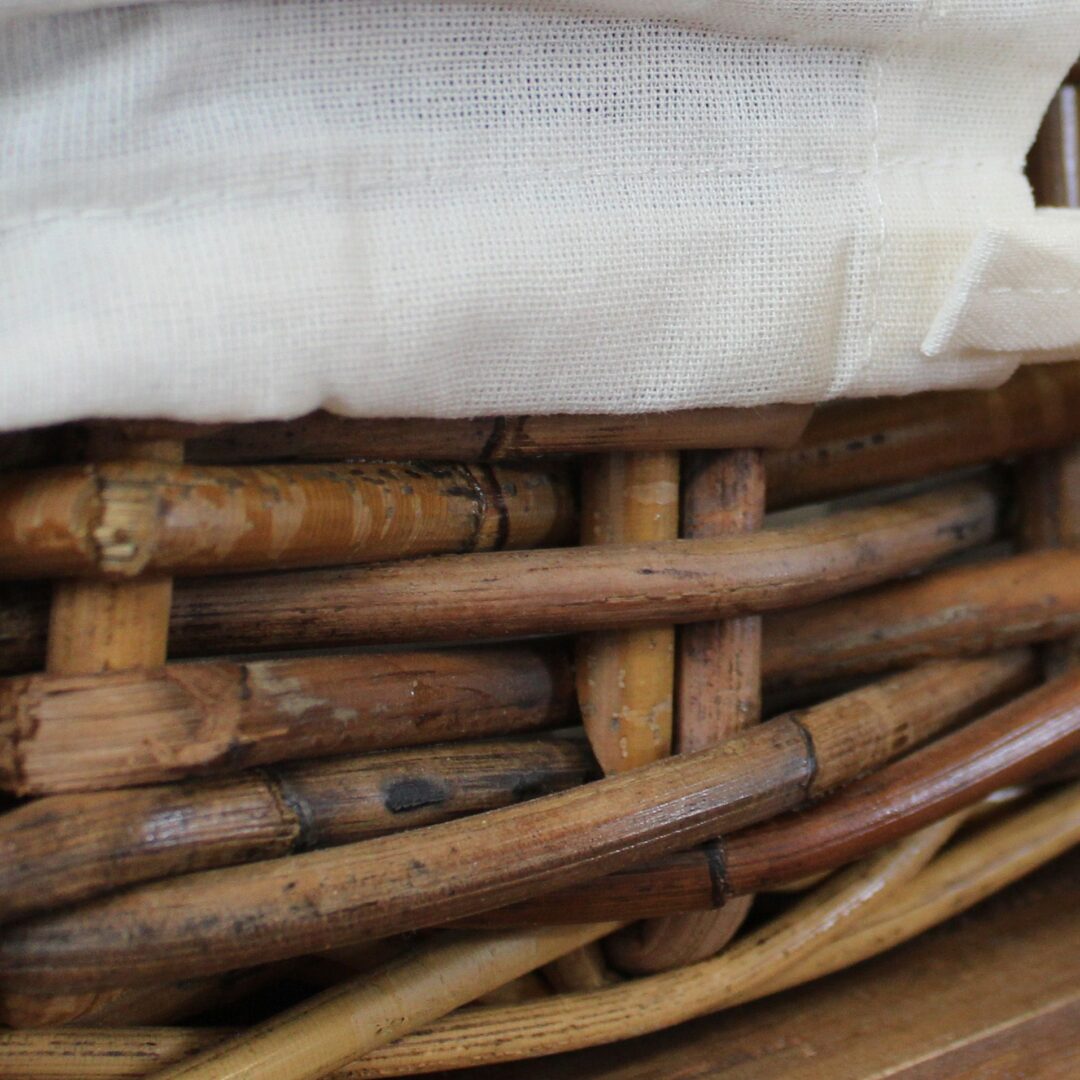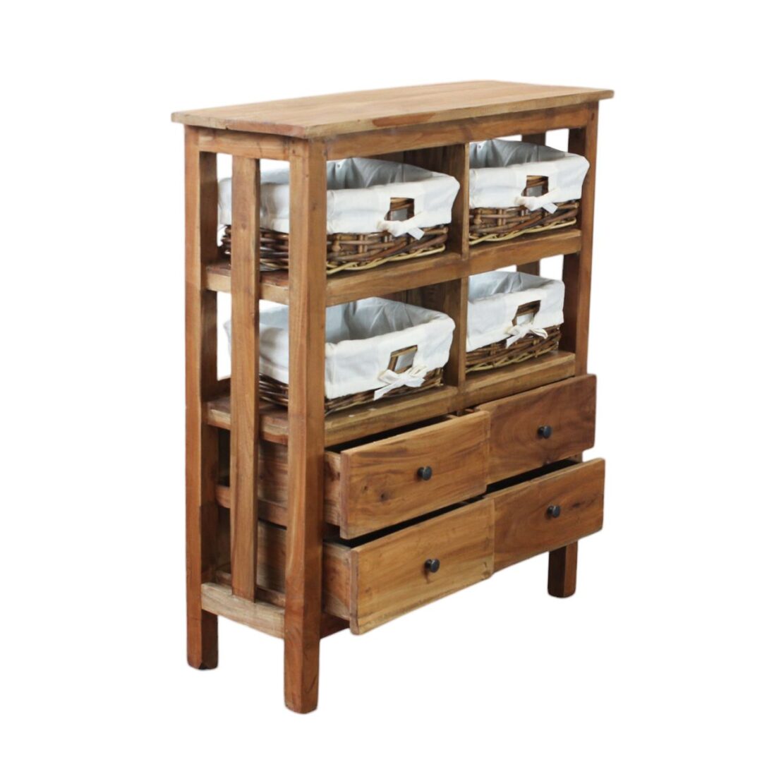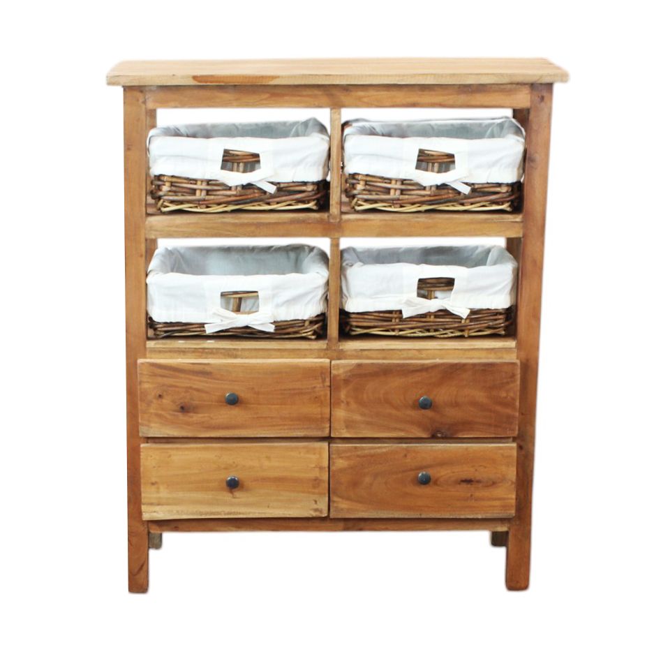 La struttura in legno massello, arricchita da venature autentiche e piccole irregolarità naturali, ospita quattro spaziosi cassetti e quattro eleganti cesti intrecciati in rattan, rivestiti con un delicato tessuto bianco.