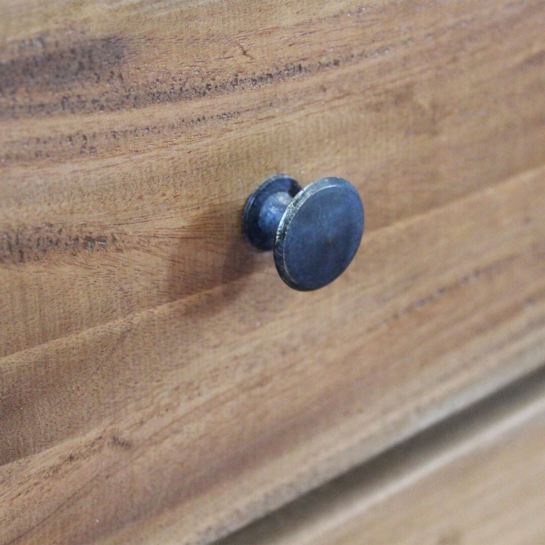 I pomelli in metallo brunito, dal gusto vintage, completano il design con sobria raffinatezza.