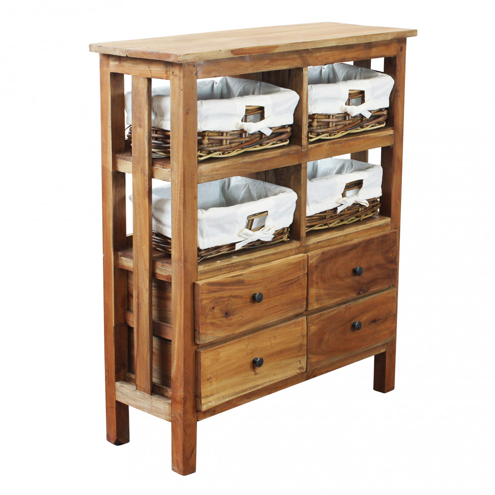 Mobile realizzato in legno di recupero, completo di quattro cesti in rattan intrecciato con rivestimento interno bianco e quattro cassetti dotati di maniglie in metallo. Un elemento d’arredo che unisce funzionalità, stile e sostenibilità ambientale. Ideale per arredare con gusto spazi caldi, accoglienti e pieni di personalità.