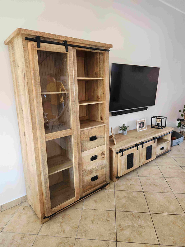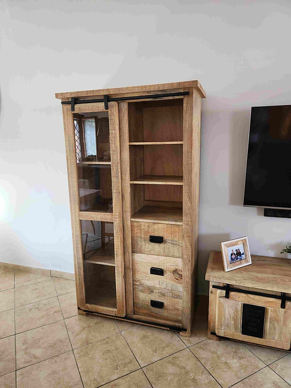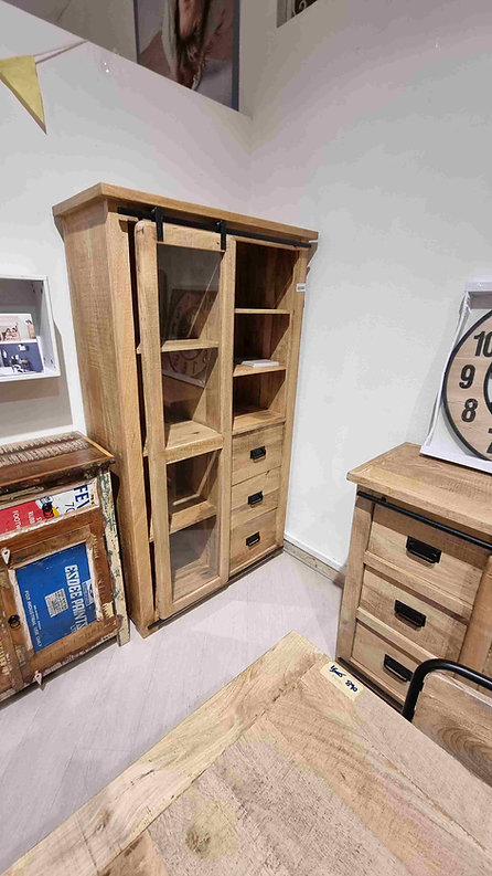 Mobile Vetrina Jupiter Naturale, Vetrina in legno massello riciclato colorato con finiture in ferro battuto e ghisa. Vetrina composta da 1 anta scorrevole con 4 ripiani all’interno, altri 3 ripiani a giorno, 3 cassetti. Scegli di abbinarci anche le credenze disponibili in varie misure, visitando il nostro shop on line.