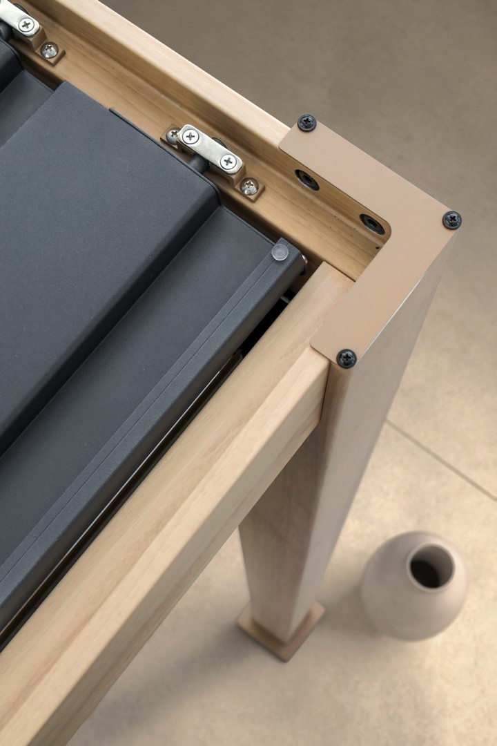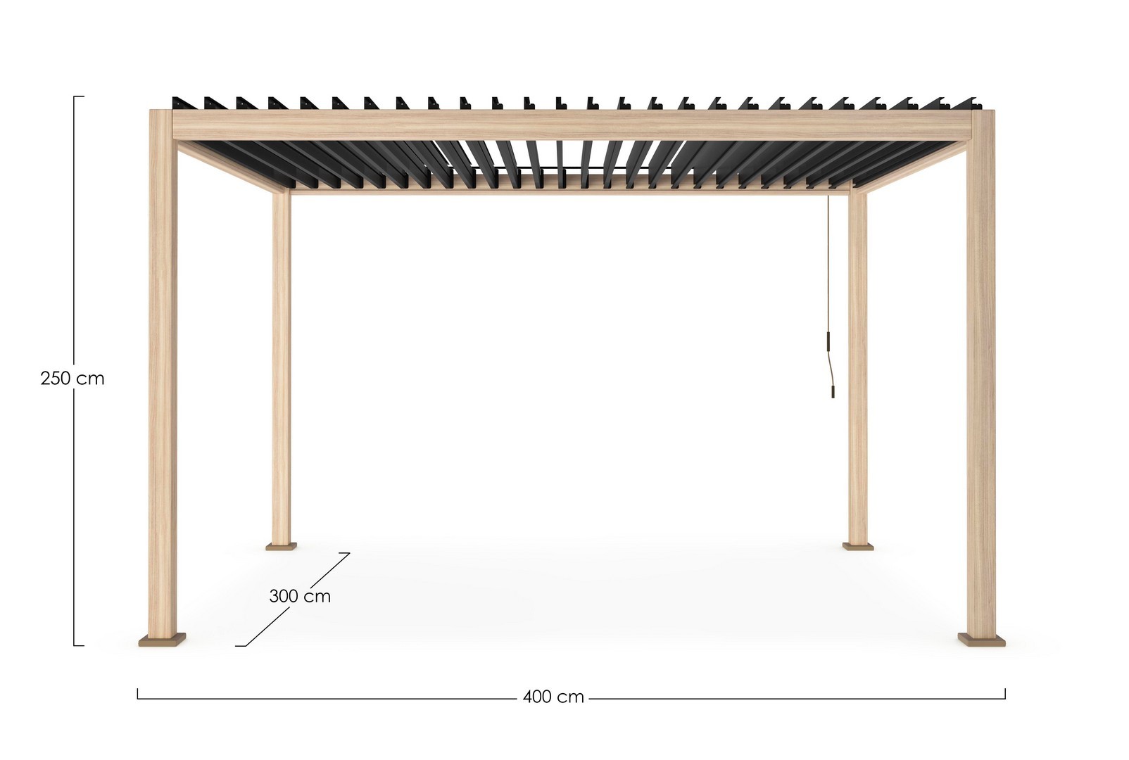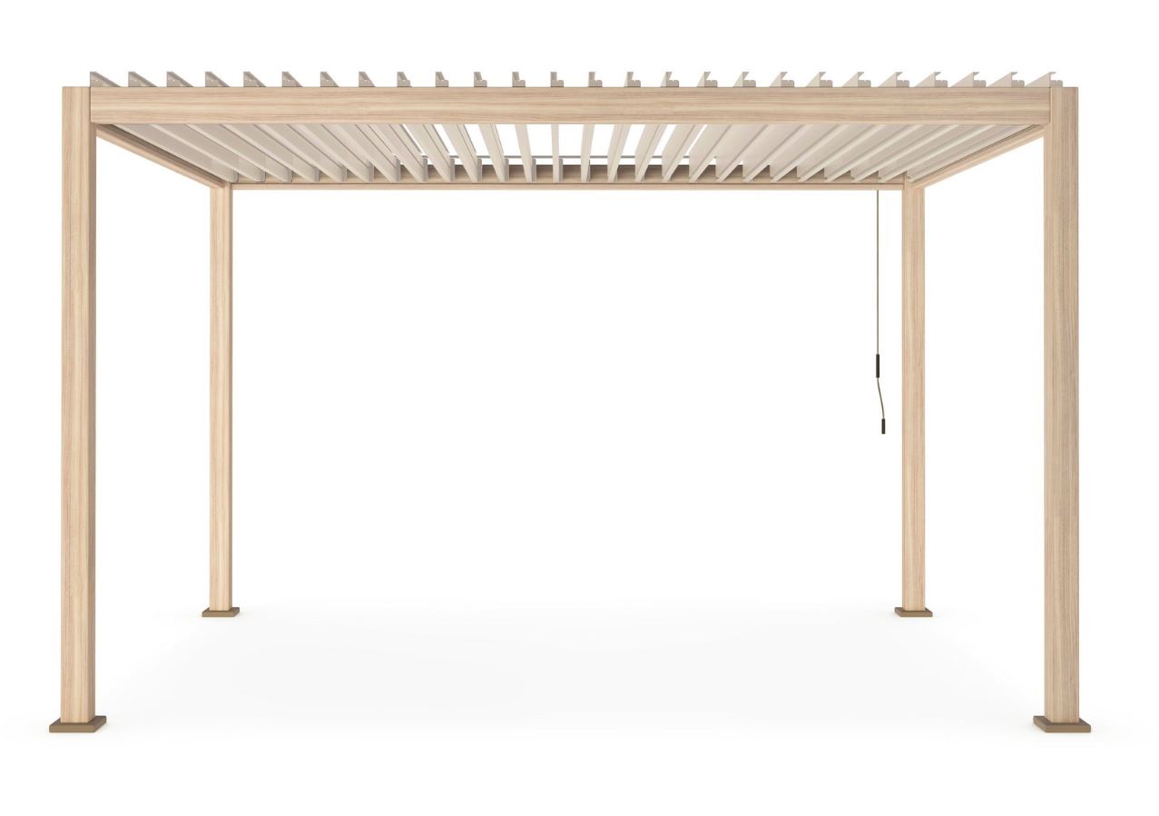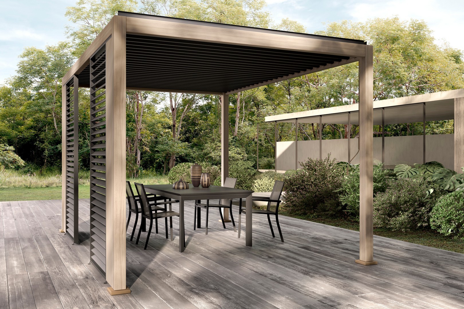Alluminio verniciato a polvere (poliestere). Pali portanti 111 x 111mm, traversi 140x75mm. Tetto lamellare orientabile tramite manovella. Lame frangisole a doppio strato 173 x 30 mm. Sistema di deflusso dell’acqua integrato all’interno dei pali portanti. Viteria in acciaio inossidabile.