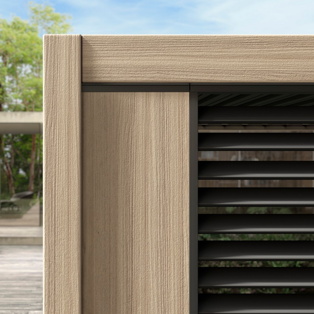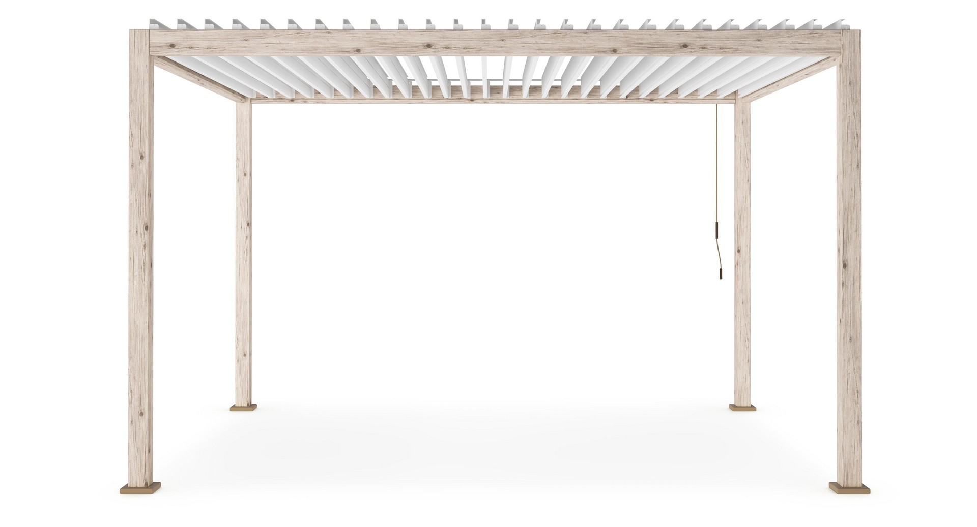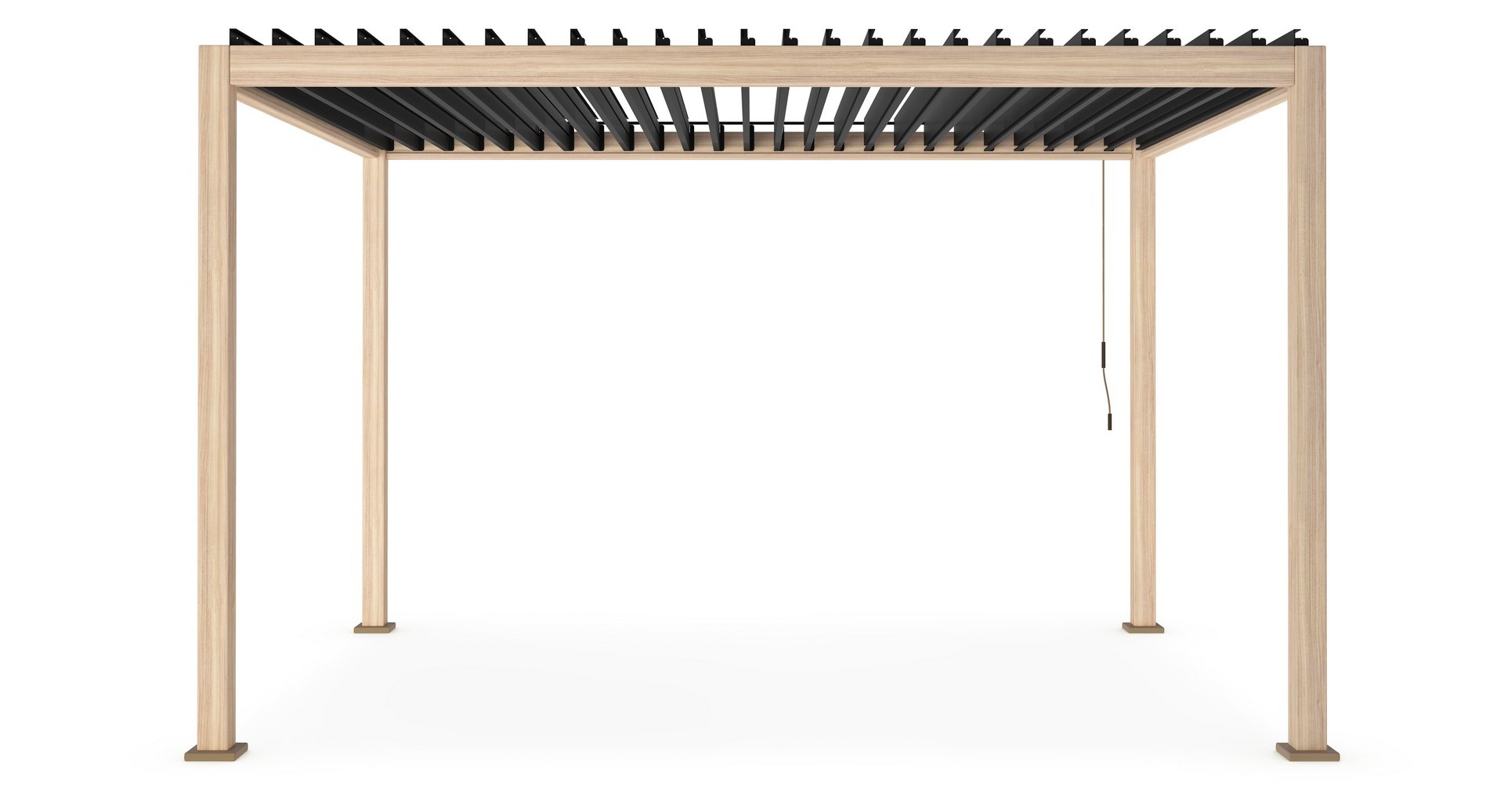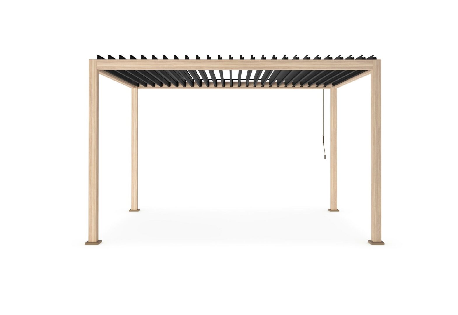 Alluminio verniciato a polvere (poliestere). Pali portanti 111 x 111mm, traversi 140x75mm. Tetto lamellare orientabile tramite manovella. Lame frangisole a doppio strato 173 x 30 mm. Sistema di deflusso dell’acqua integrato all’interno dei pali portanti. Viteria in acciaio inossidabile.