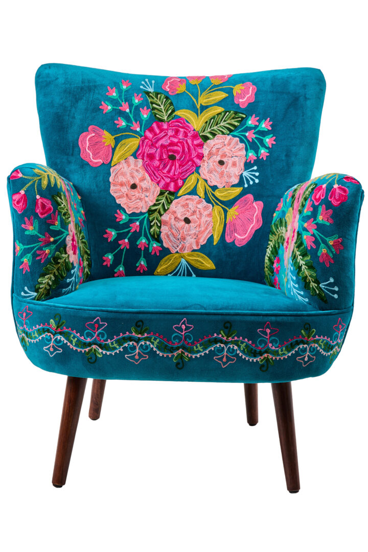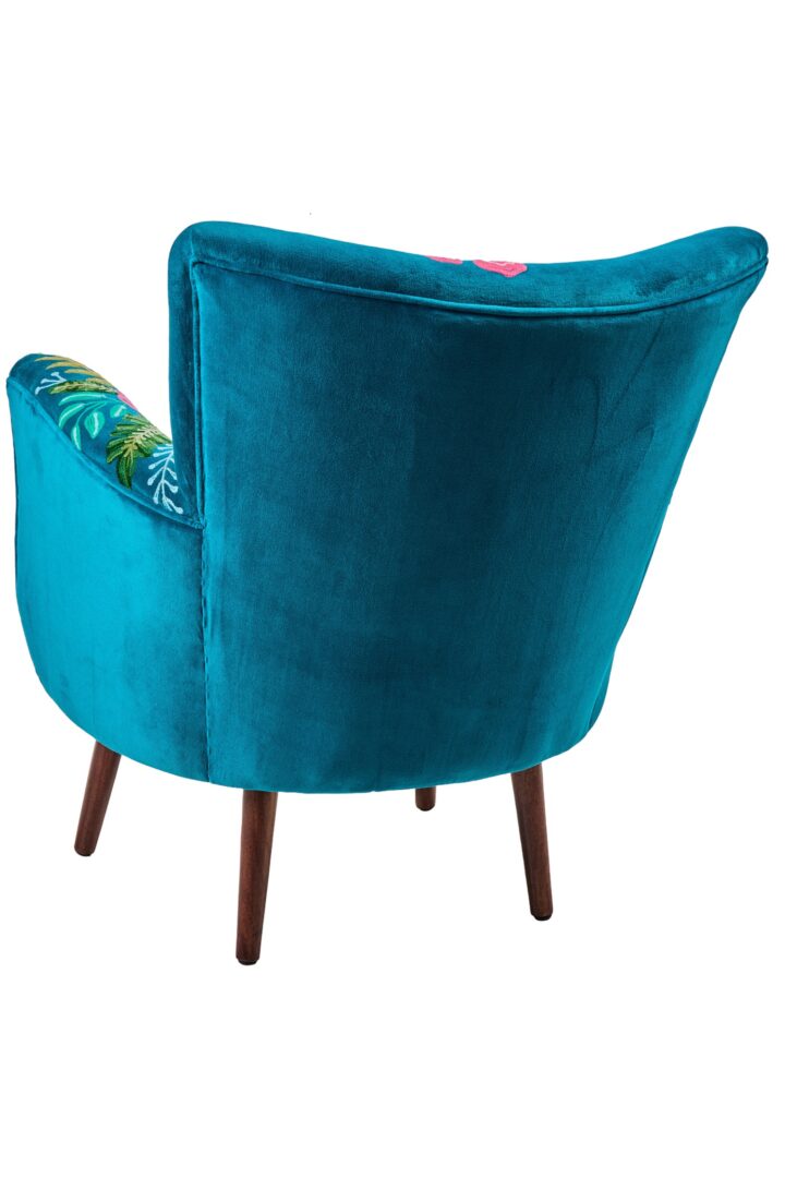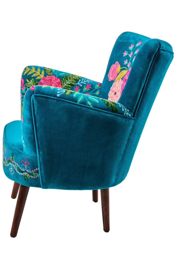 Le sue forme accoglienti e ben proporzionate offrono un comfort avvolgente, rendendola ideale per momenti di relax, lettura o conversazione. Il velluto, piacevole al tatto e visivamente ricco, valorizza la poltrona con riflessi delicati, mentre il motivo floreale aggiunge personalità e raffinatezza.
