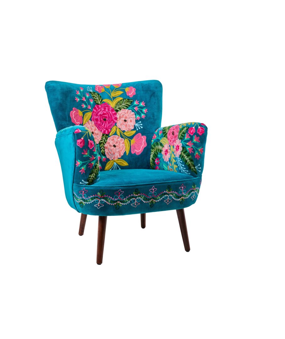 La poltrona Artemisia è un raffinato complemento d’arredo che unisce eleganza classica e gusto decorativo. Rivestita in velluto color azzurro, morbido e luminoso, si distingue per il prezioso ricamo floreale, che dona unicità e un tocco artistico alla seduta.