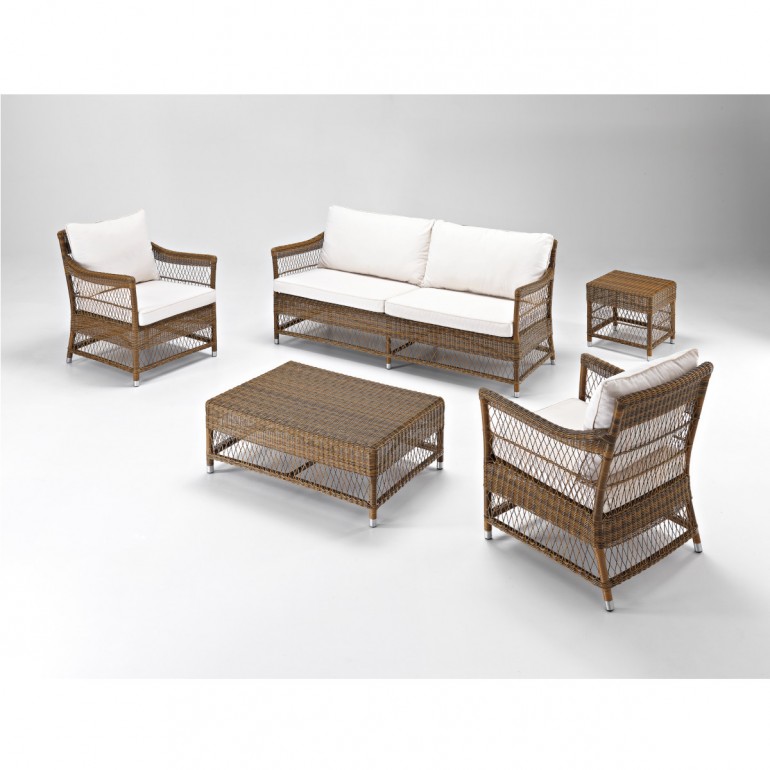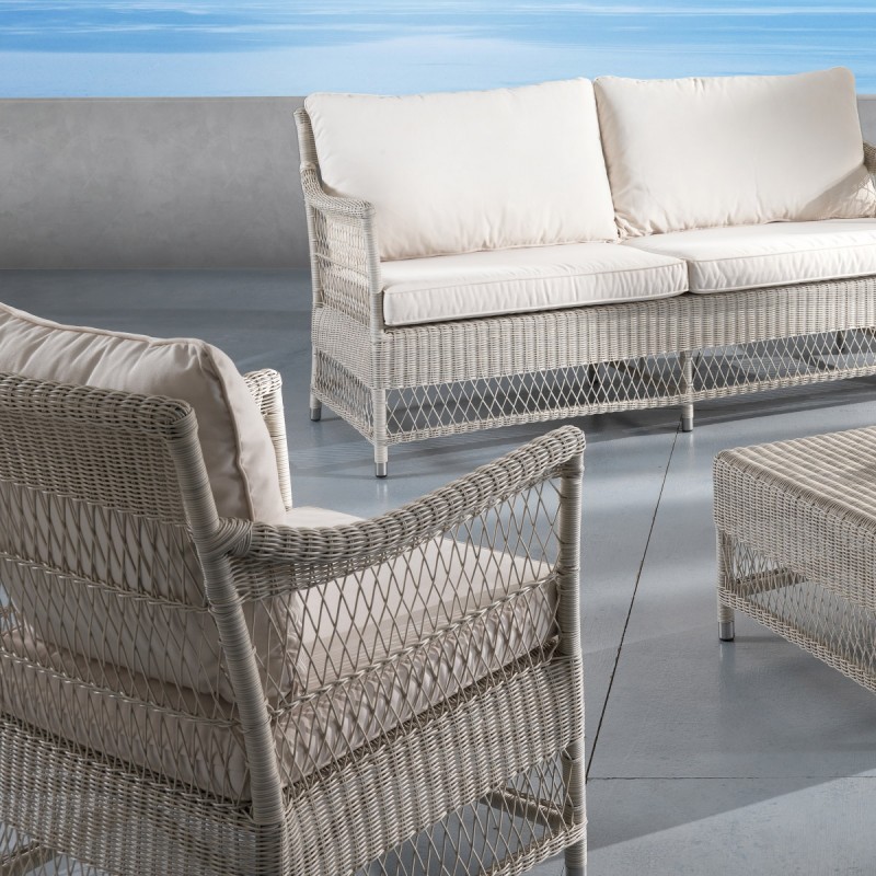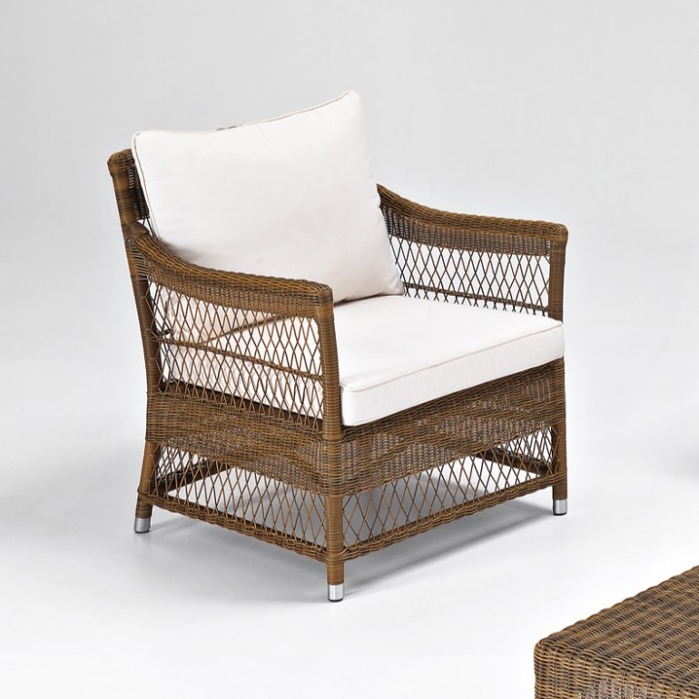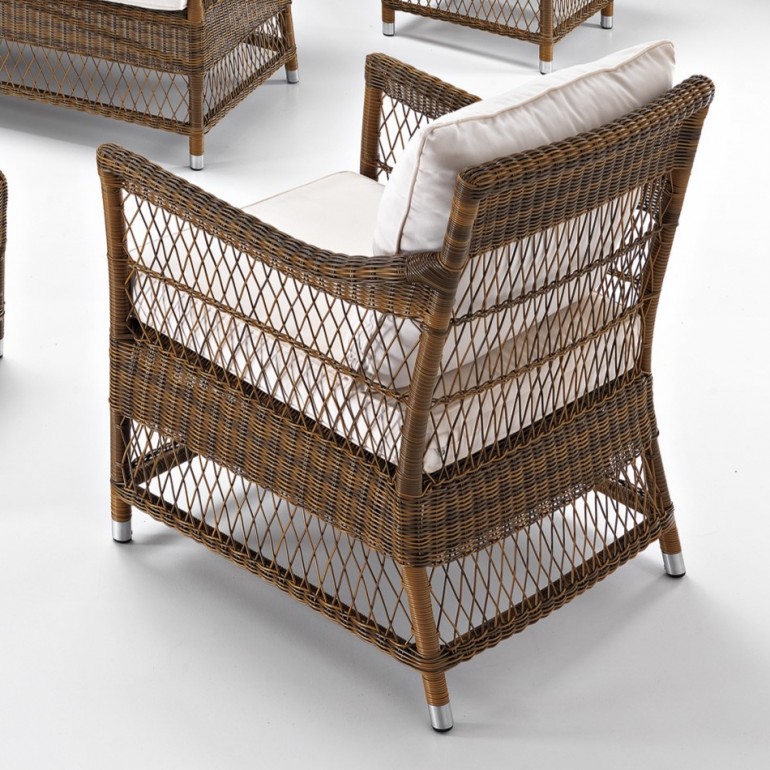 Poltrona Camille Rattan Sintetico, la poltrona per esterno “Camille” è realizzata con base e telaio in alluminio verniciato a polvere, intreccio in corda di polietilene ad alta densità.