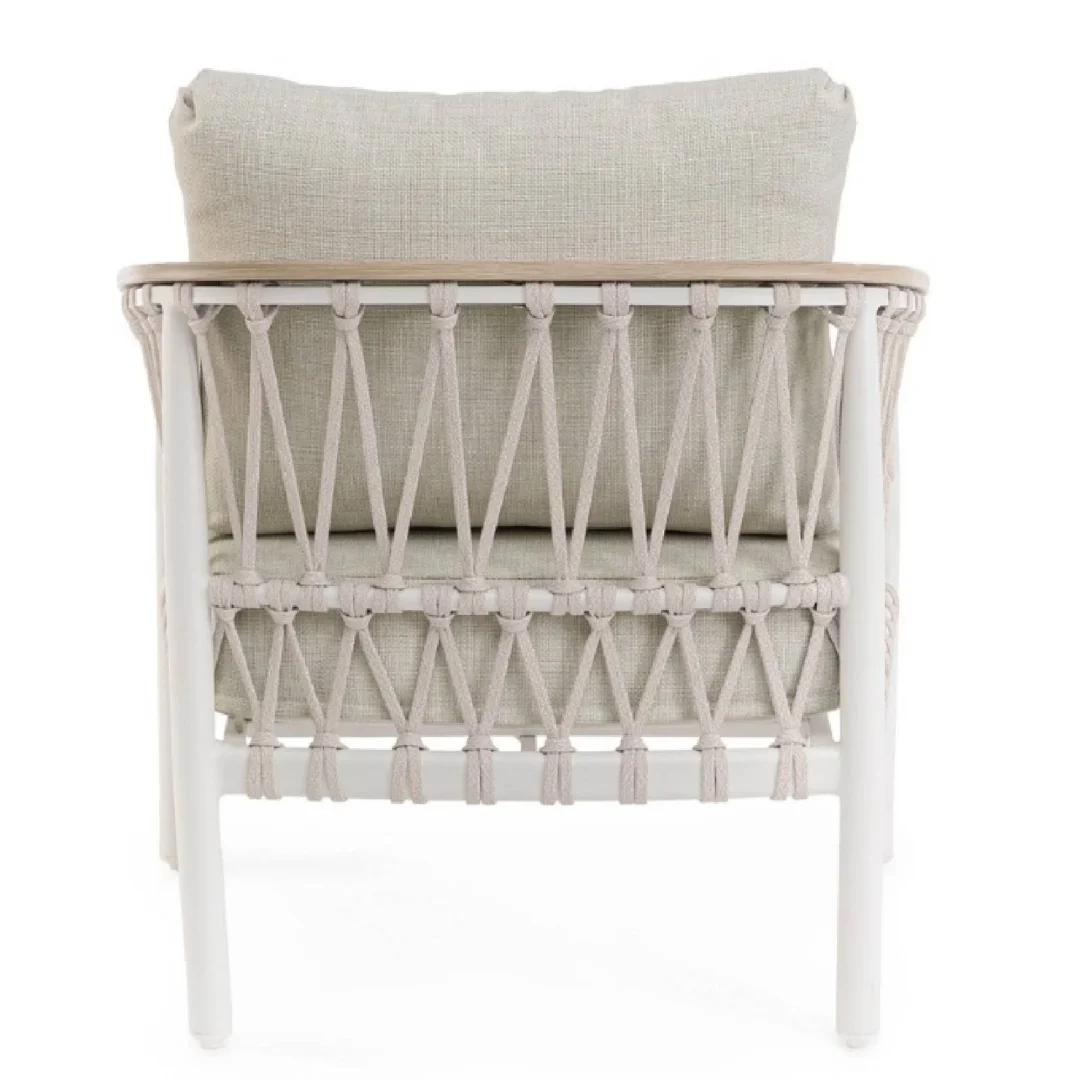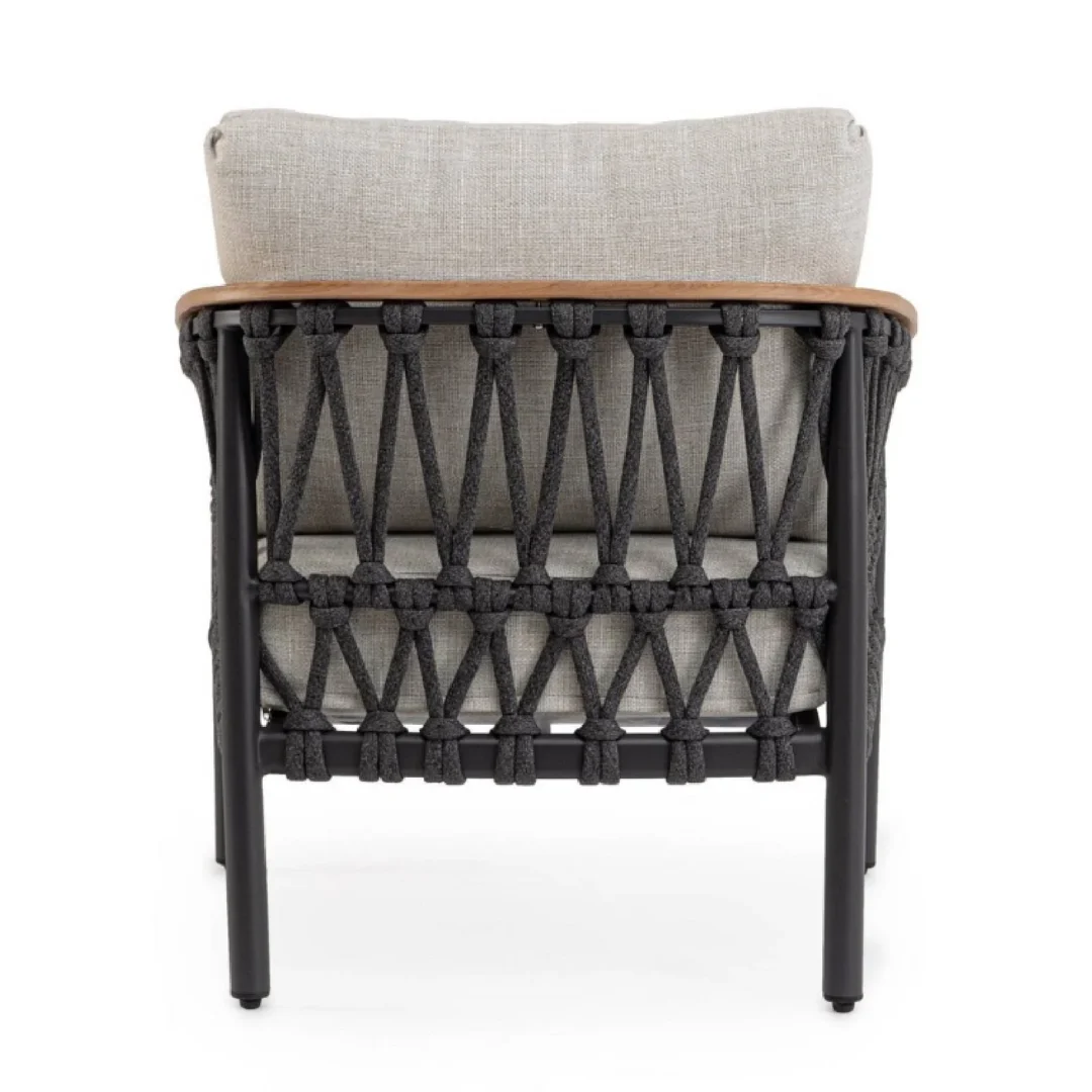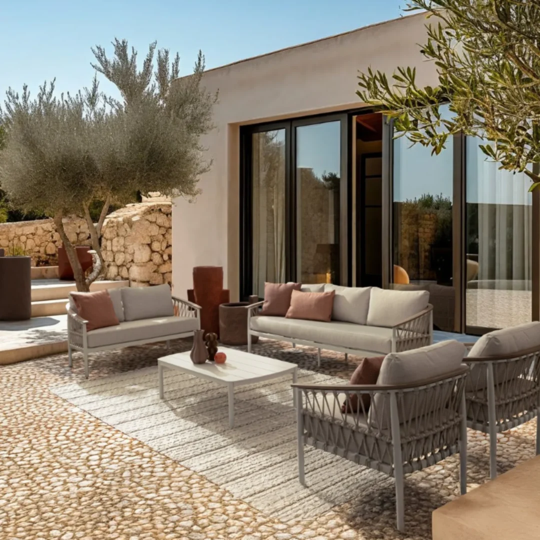 L’intreccio in corde di Textilene dona carattere e personalità al design, assicurando al tempo stesso resistenza, elasticità e comfort nella seduta. I cuscini di seduta e schienale, completamente sfoderabili, sono rivestiti in tessuto Olefin idrorepellente, progettato per offrire una piacevole morbidezza e una lunga durata nel tempo anche in presenza di sole e umidità. Con il suo stile equilibrato e curato nei dettagli, il divano Fenix è ideale per arredare giardini, terrazze e zone relax outdoor con eleganza, funzionalità e qualità.