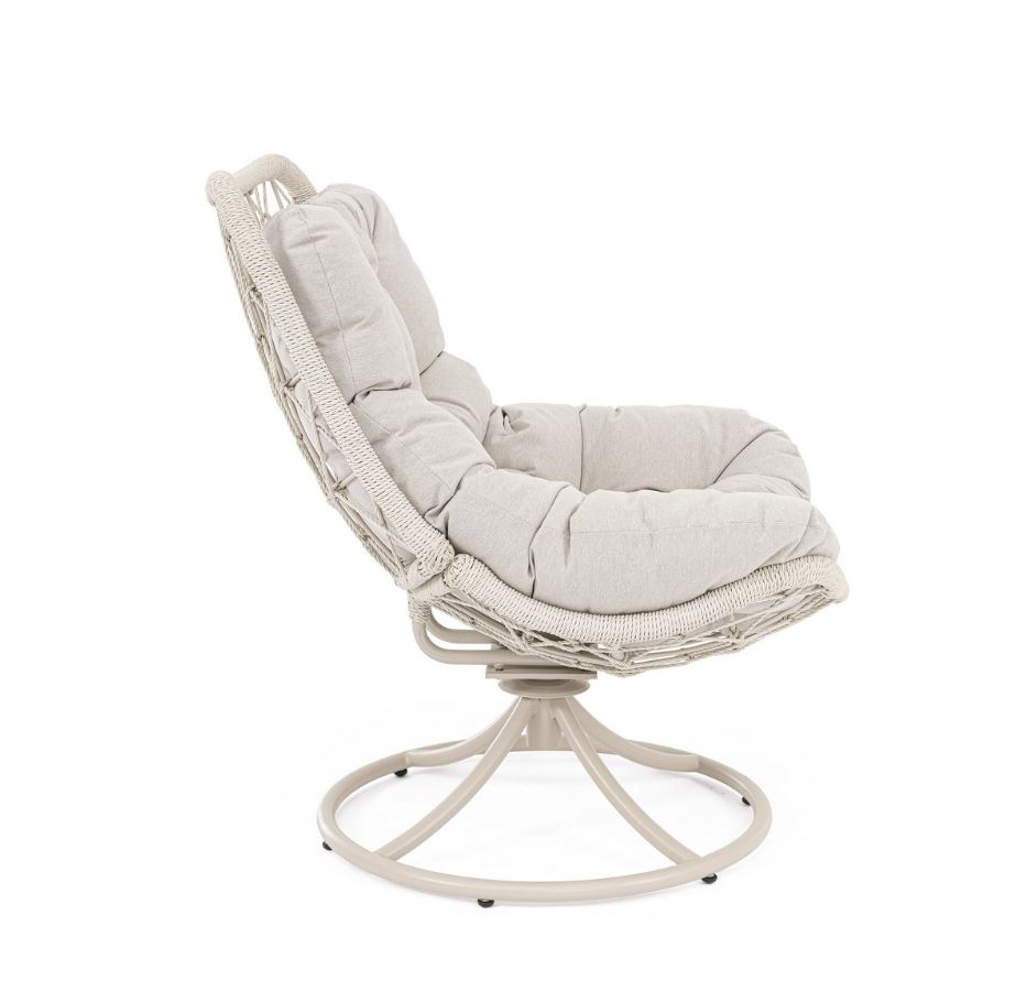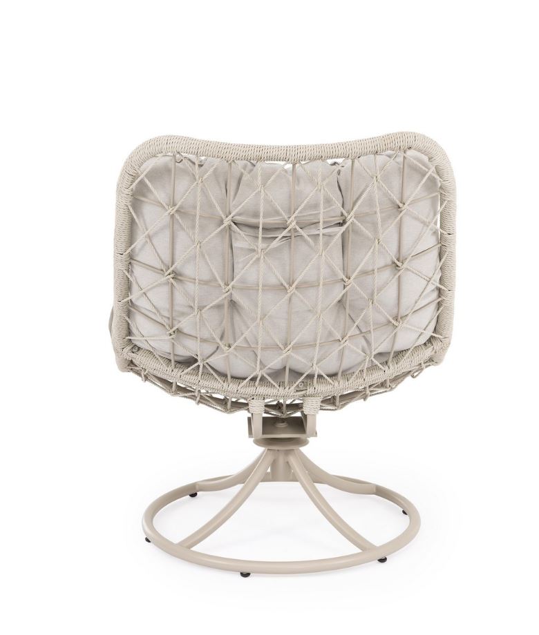 La struttura in acciaio trattata per l’esterno garantisce solidità, stabilità e un’elevata resistenza agli agenti atmosferici, assicurando una lunga durata nel tempo. L’intreccio in fibra sintetica tonda da 5 mm avvolge la seduta con eleganza, conferendo alla poltrona un carattere moderno e una piacevole leggerezza visiva, oltre a offrire un supporto confortevole e resistente all’uso quotidiano.