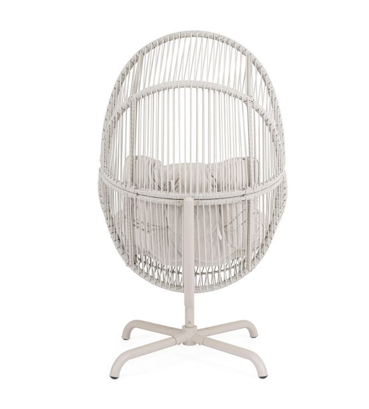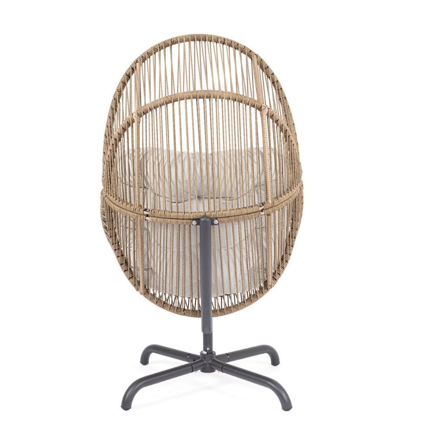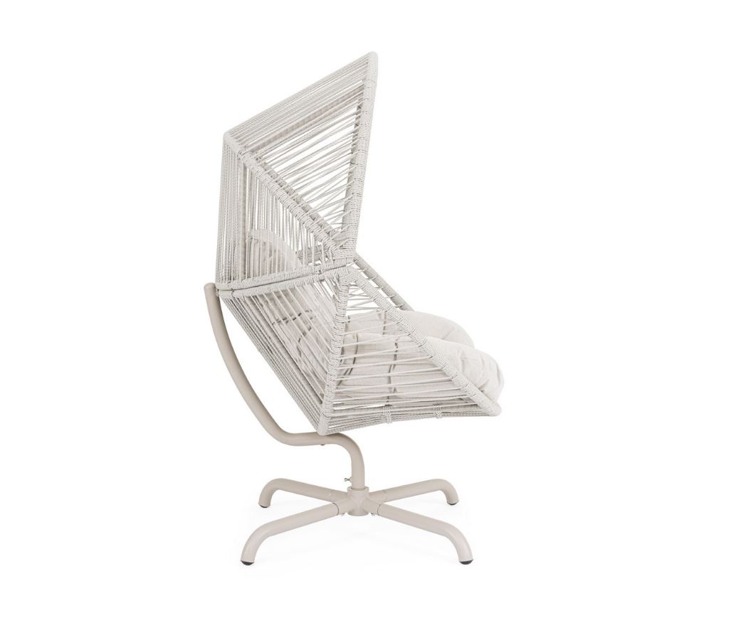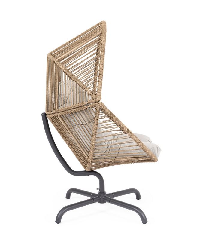 La struttura in acciaio trattata per l’esterno assicura solidità, stabilità e un’eccellente resistenza agli agenti atmosferici, garantendo affidabilità e durata nel tempo. L’intreccio in fibra sintetica tonda da 5 mm avvolge la seduta con un effetto leggero e ricercato, conferendo carattere alla poltrona e offrendo al tempo stesso un supporto confortevole e resistente all’uso quotidiano.