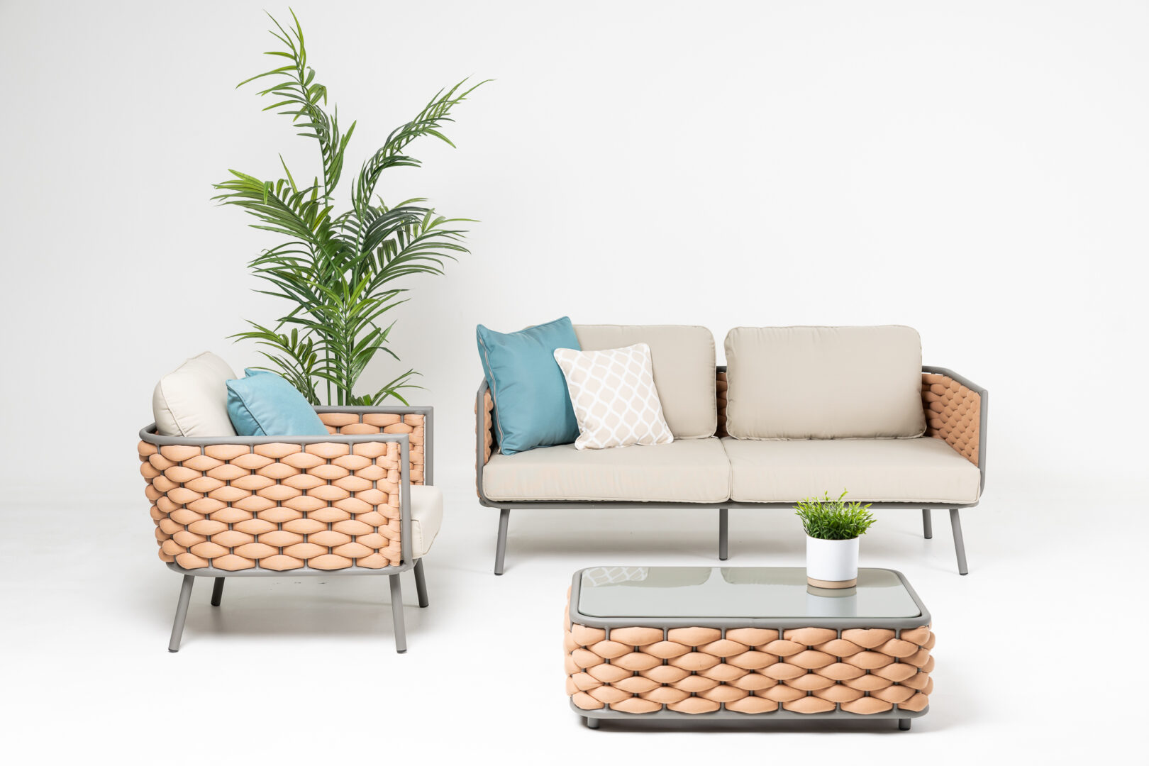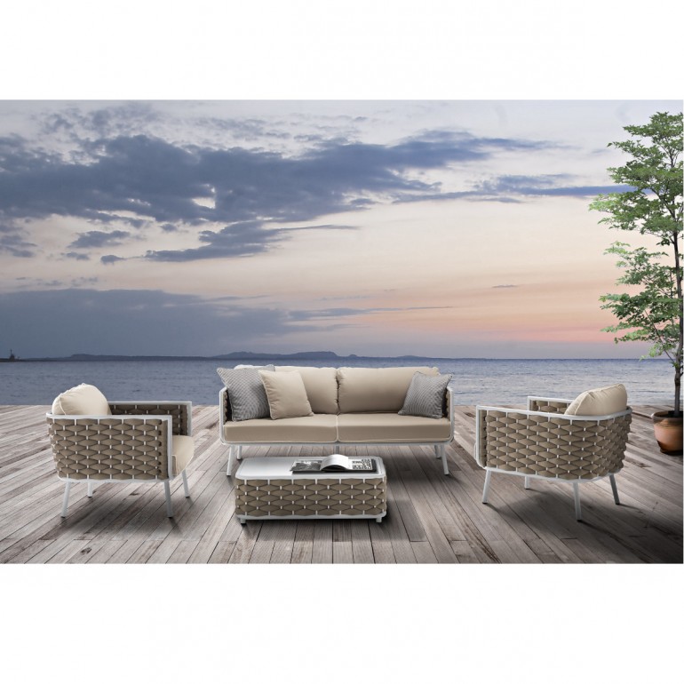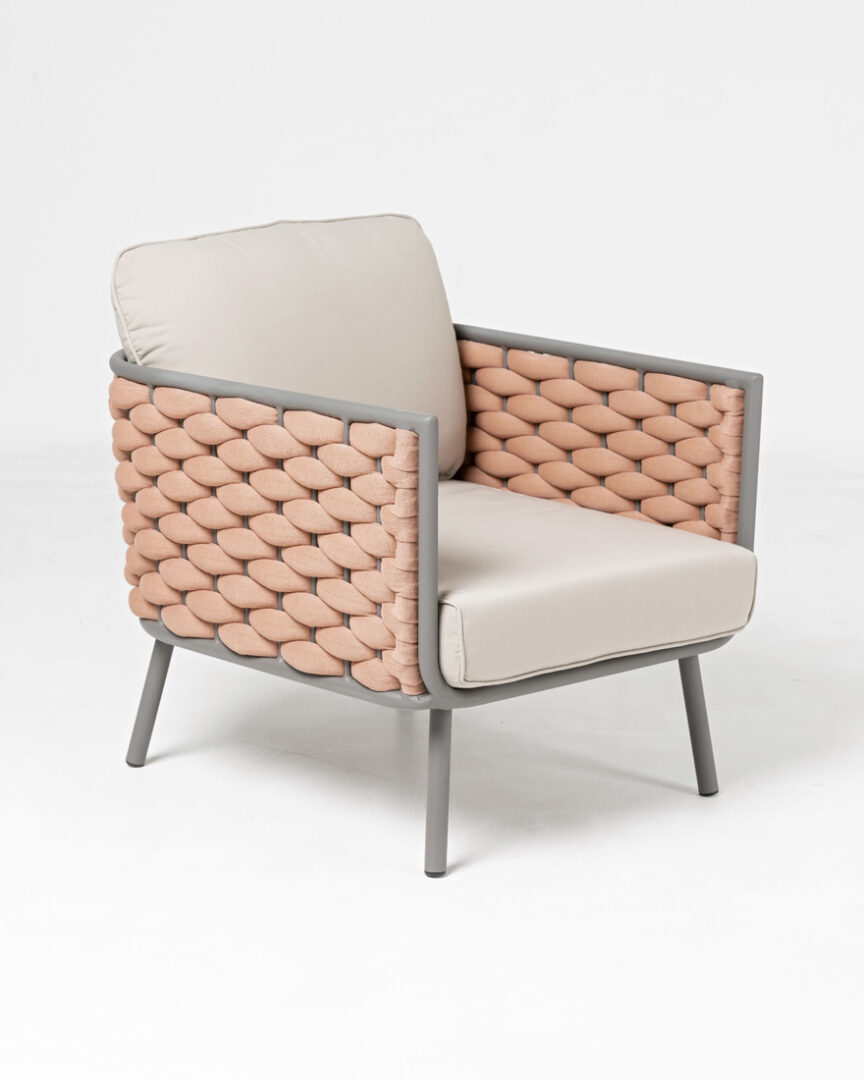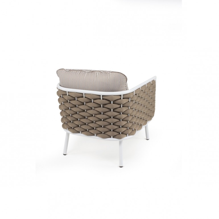 Poltrona Manhattan , è realizzata con base e telaio in alluminio verniciato a polvere, intreccio fatto a mano con tessuto tubolare Sunproof (100% Olefin), imbottito in poliuretano espanso con guaina protettiva.
