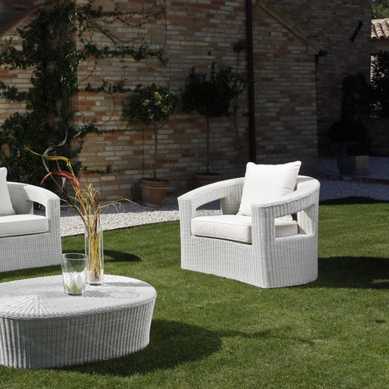 Poltrona Oasi Rattan Sintetico, poltrona “Oasi” è realizzata con base e telaio in alluminio verniciato a polvere, intreccio in corda di polietilene ad alta densità.