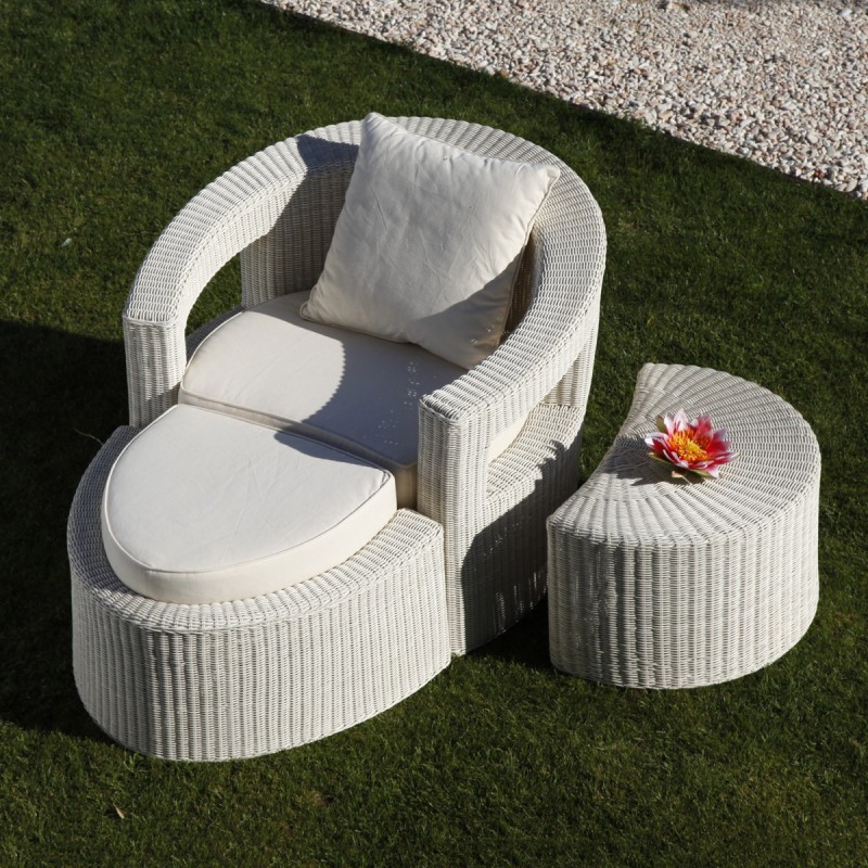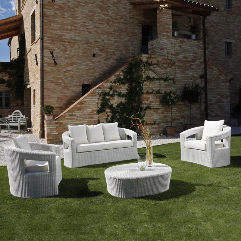 La fibra polyrattan (rattan sintetico) utilizzata è di marca REHAU). Resistente ad agenti atmosferici e escursioni termiche.
