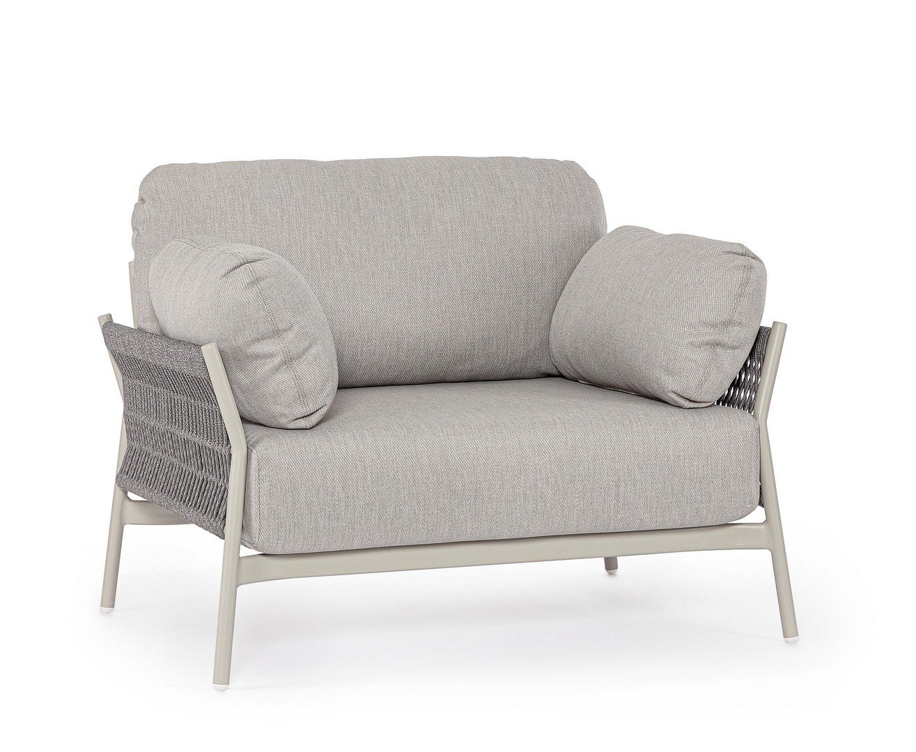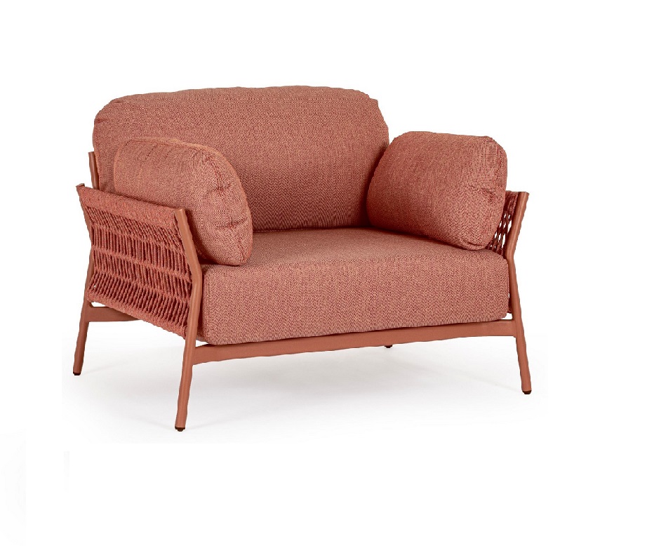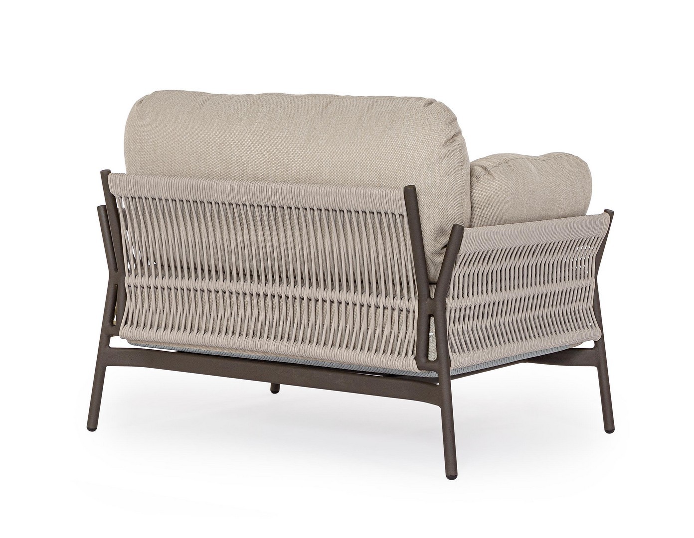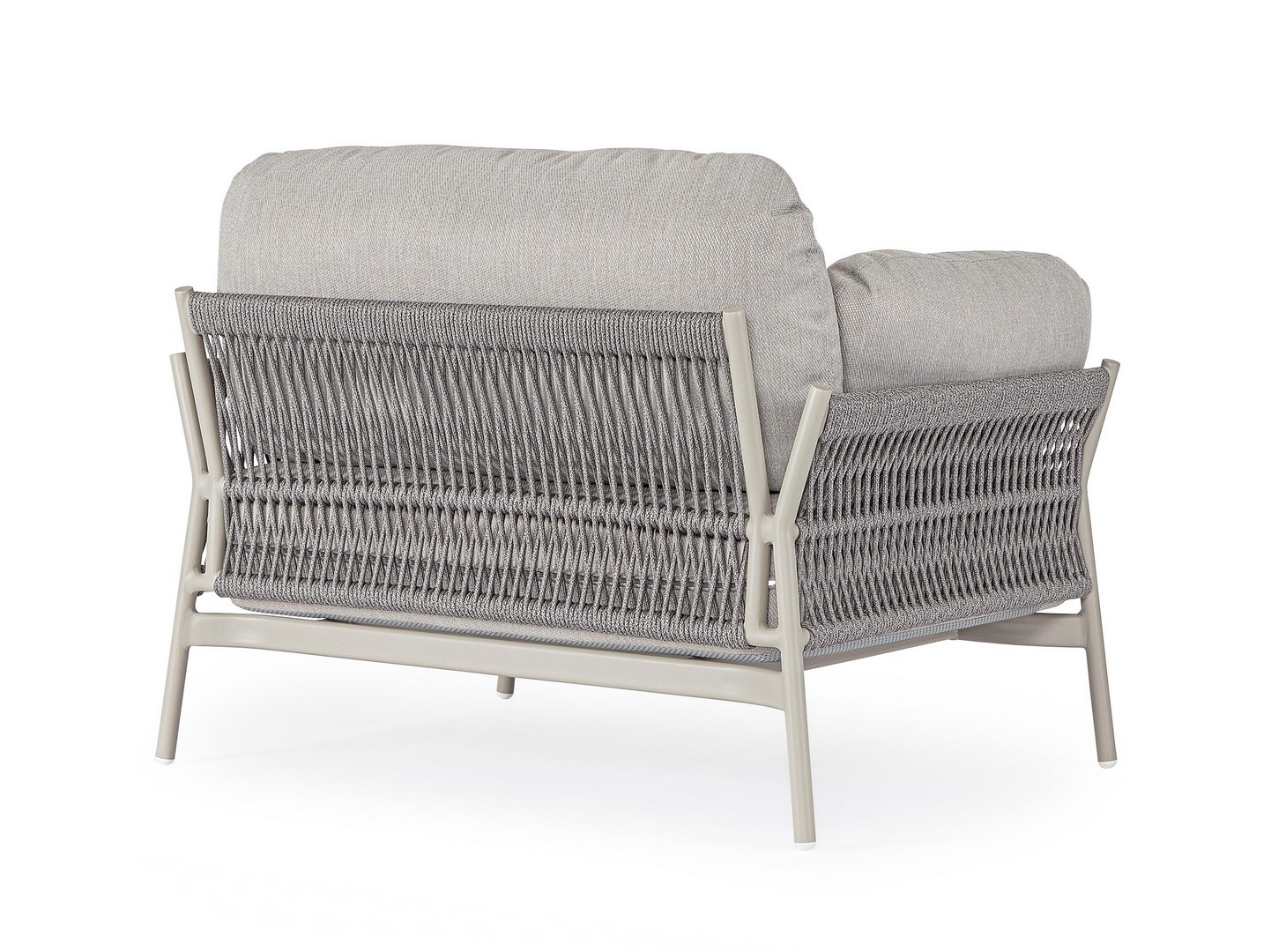 La struttura della poltrona è realizzata con struttura in alluminio verniciato e l’intreccio è in corda olefin (100% polipropilene). Cuscini e seduta schienale, sfoderabili, sono realizzati con tessuto Olefin. Grazie all’alta qualità dei materiali utilizzati per la sua costruzione, questo prodotto può rimanere all’esterno sia d’estate che d’inverno, senza temere particolarmente le intemperie e gli agenti atmosferici. La sua fibra certificata ne garantisce la resistenza a pioggia, raggi uv, vento e salsedine.