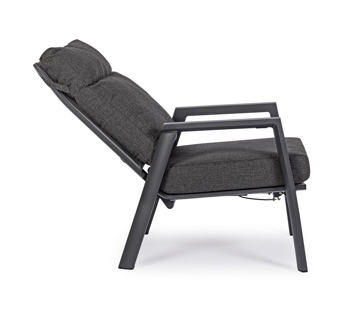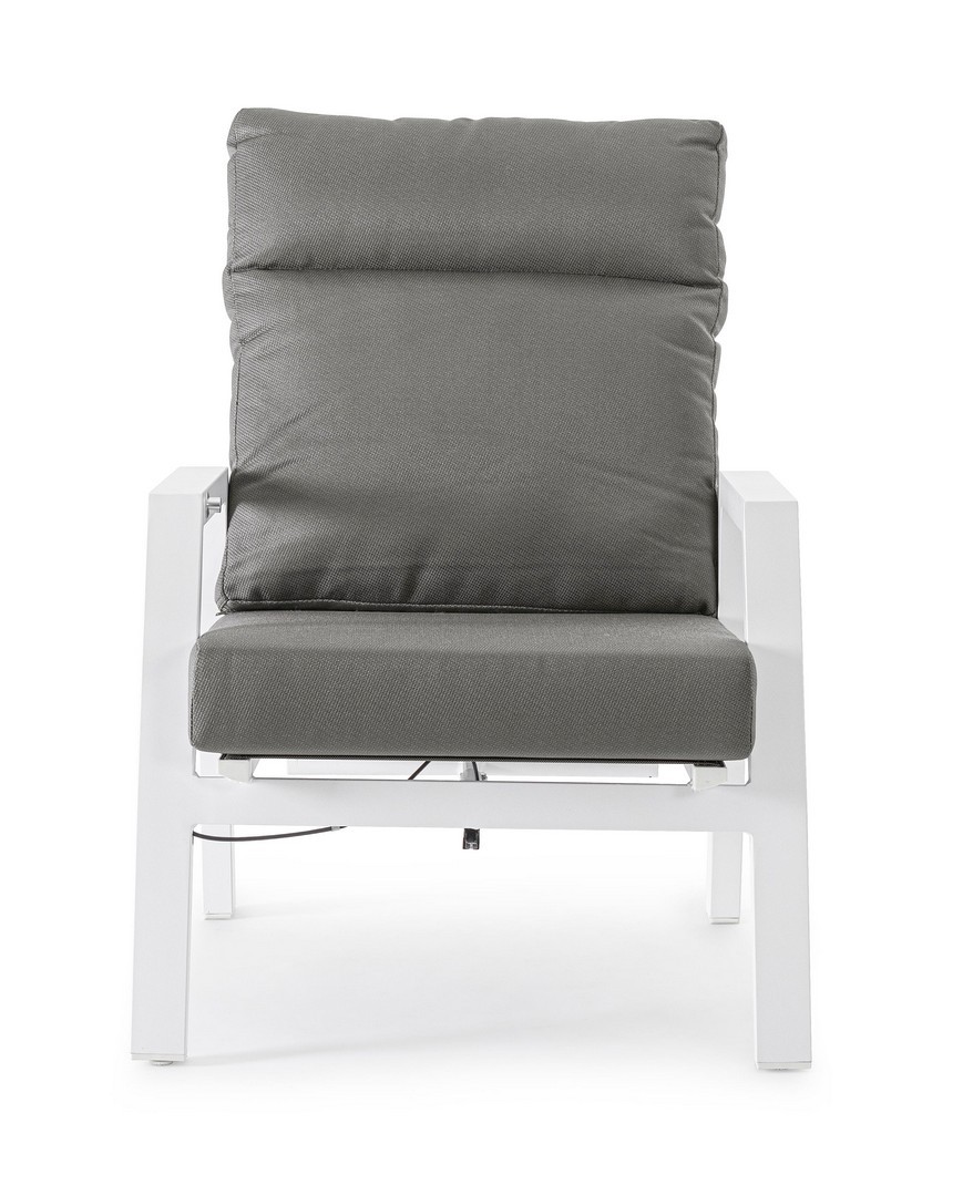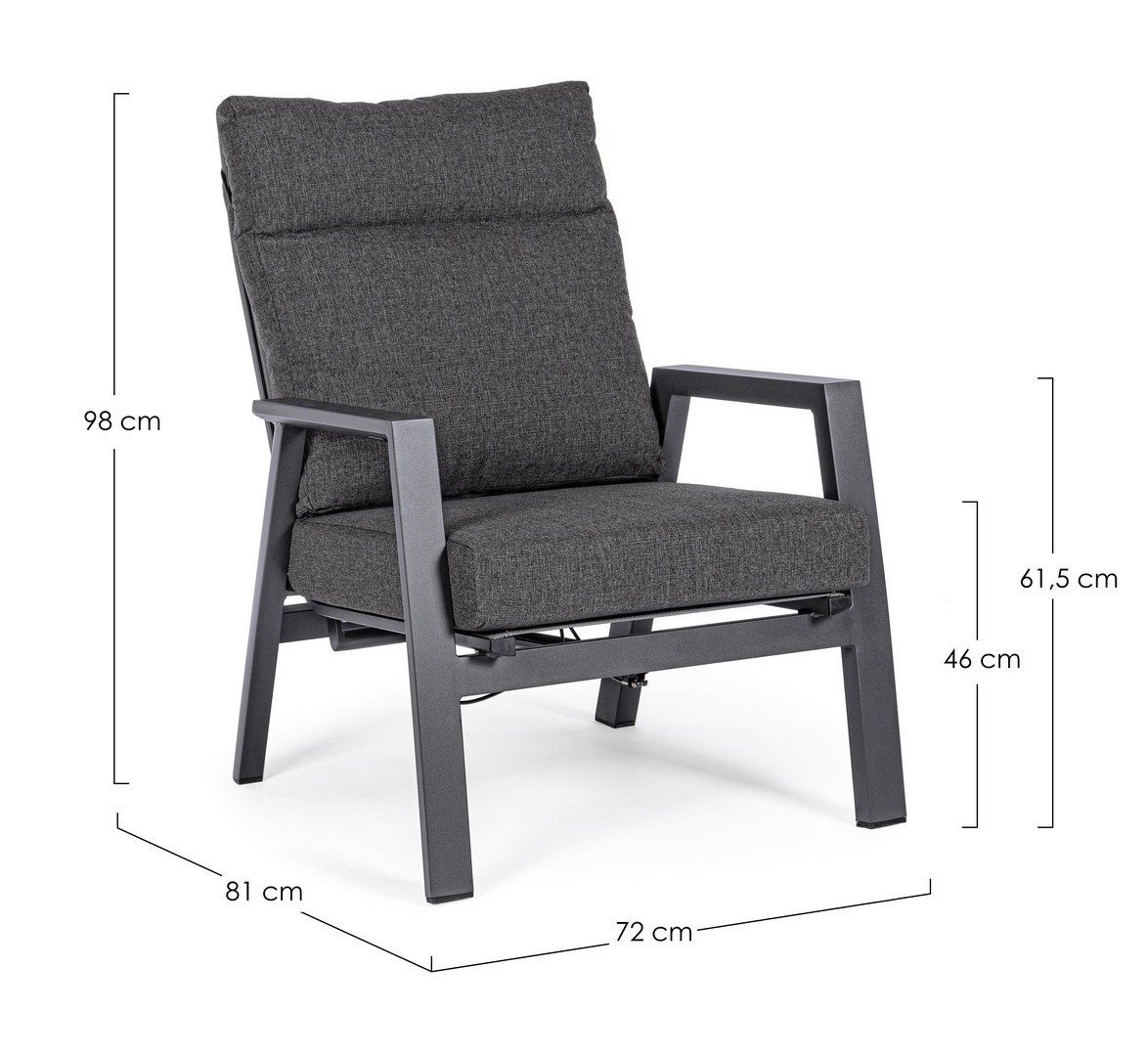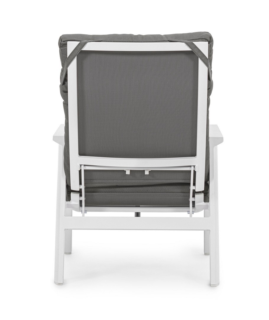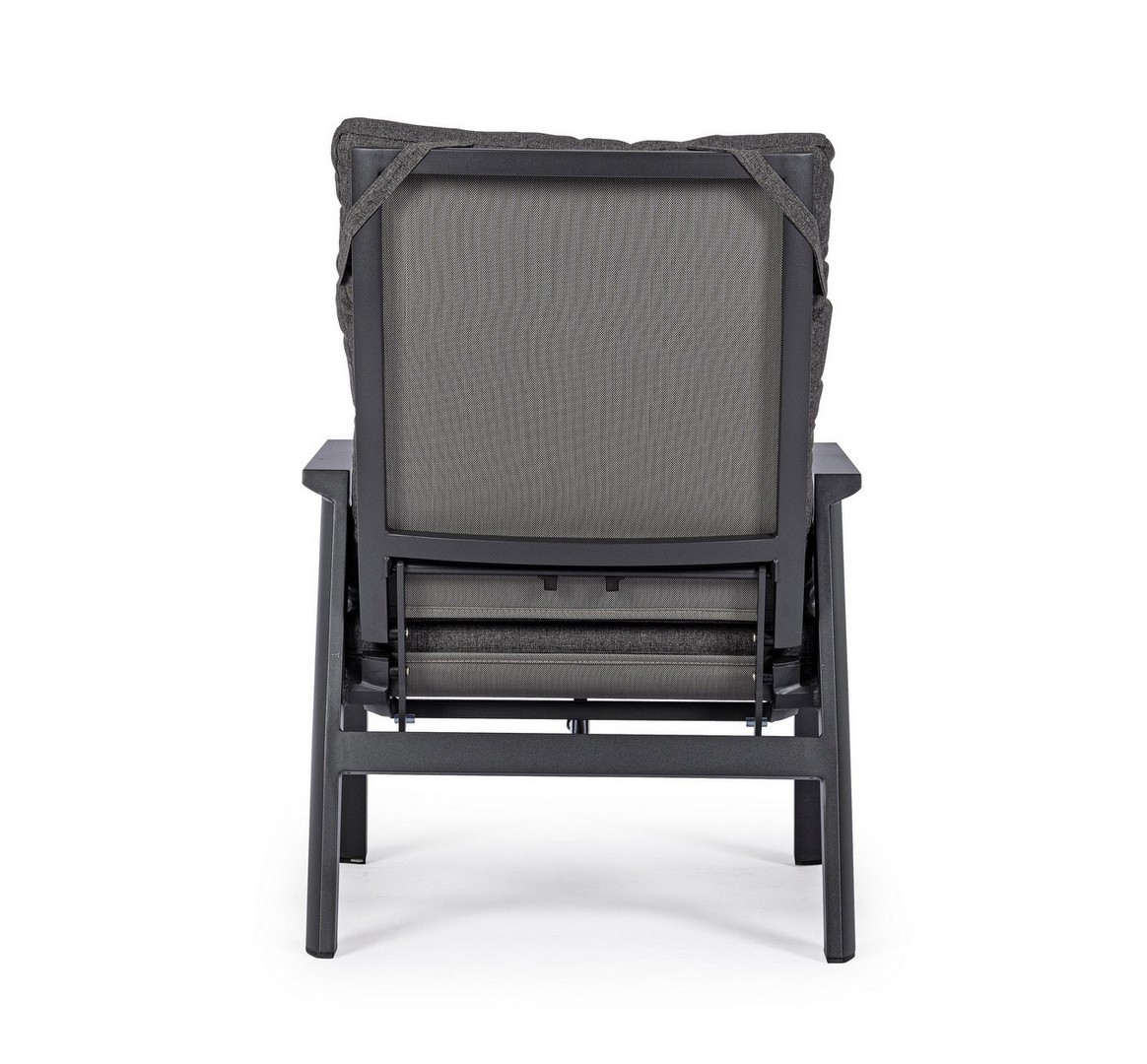 POLTRONA RECLINABILE KLEDI , la struttura di questa poltrona è in alluminio verniciato a polvere (poliestere). Lo schienale è reclinabile in libera posizione e seduta in textilene 1×1. Viteria in acciaio inossidabile.