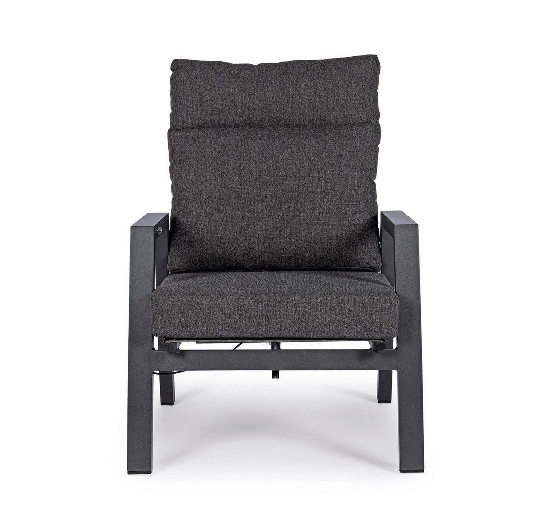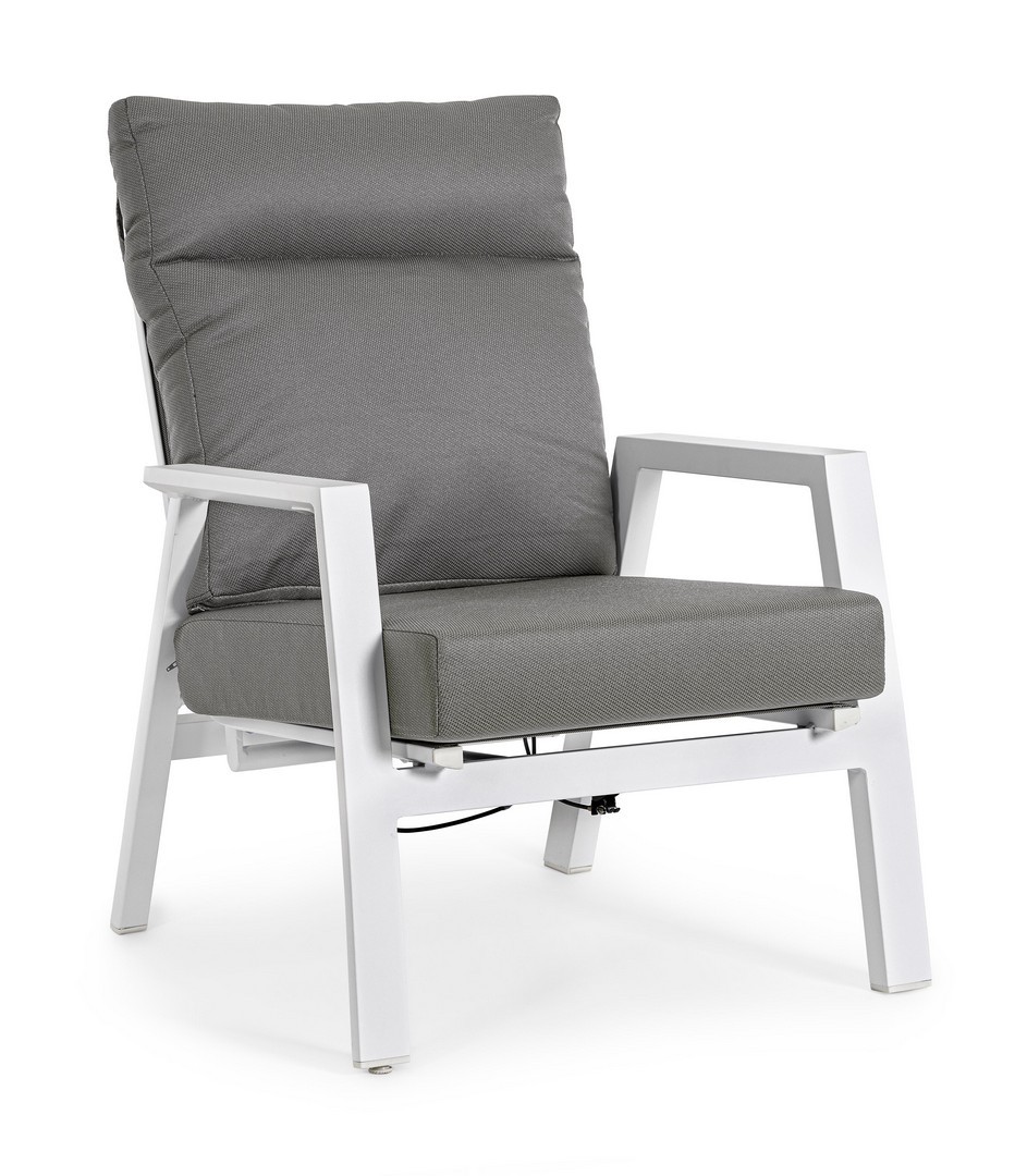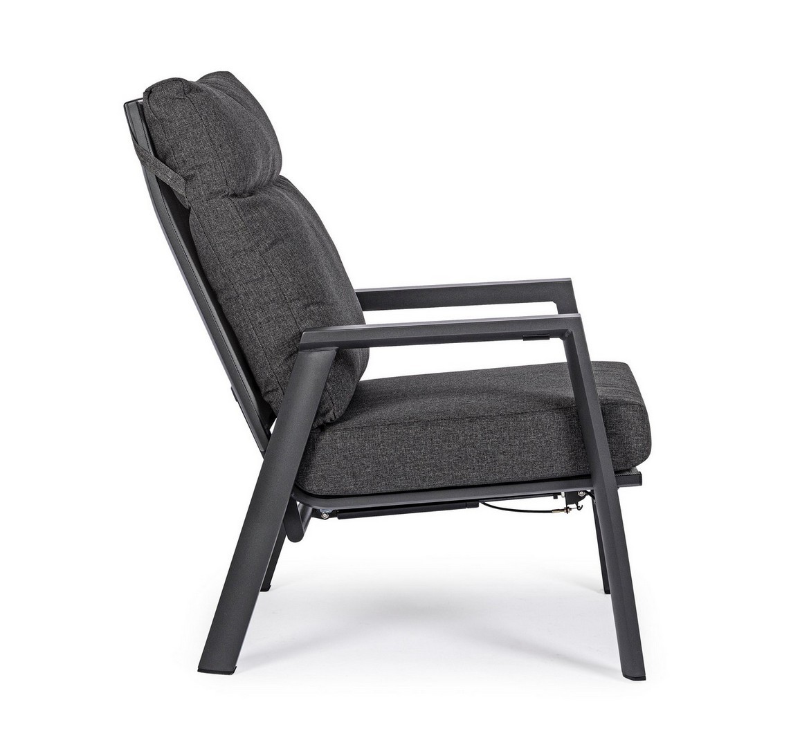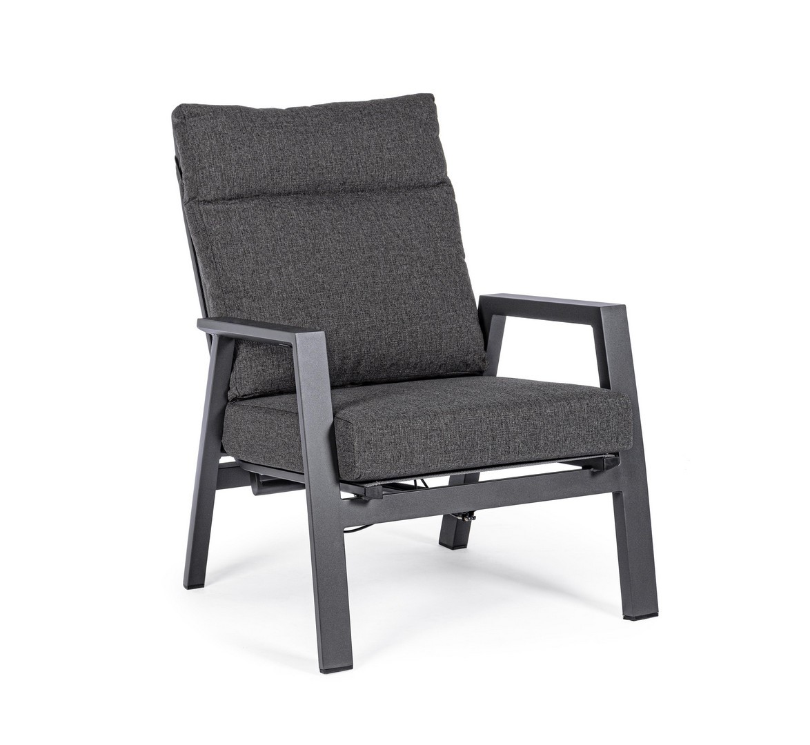 POLTRONA RECLINABILE KLEDI , la struttura di questa poltrona è in alluminio verniciato a polvere (poliestere). Lo schienale è reclinabile in libera posizione e seduta in textilene 1×1. Viteria in acciaio inossidabile.