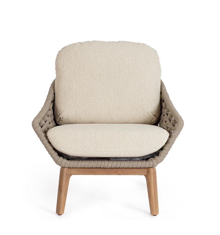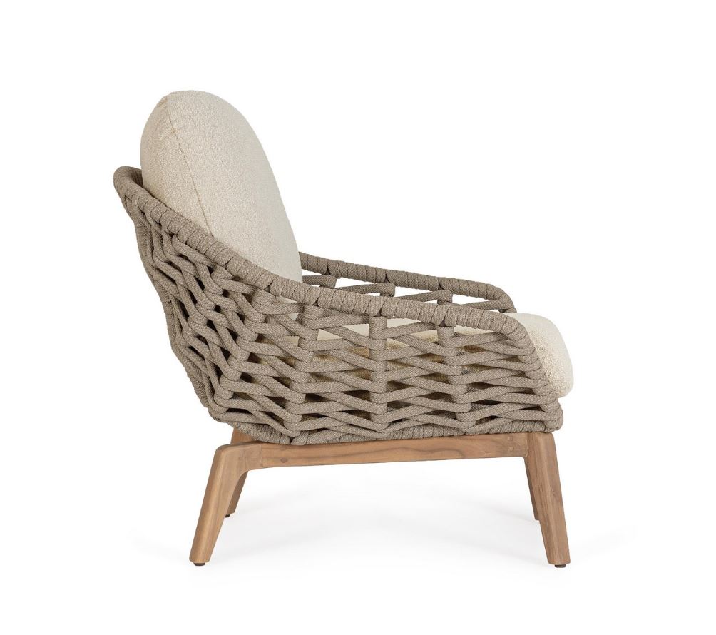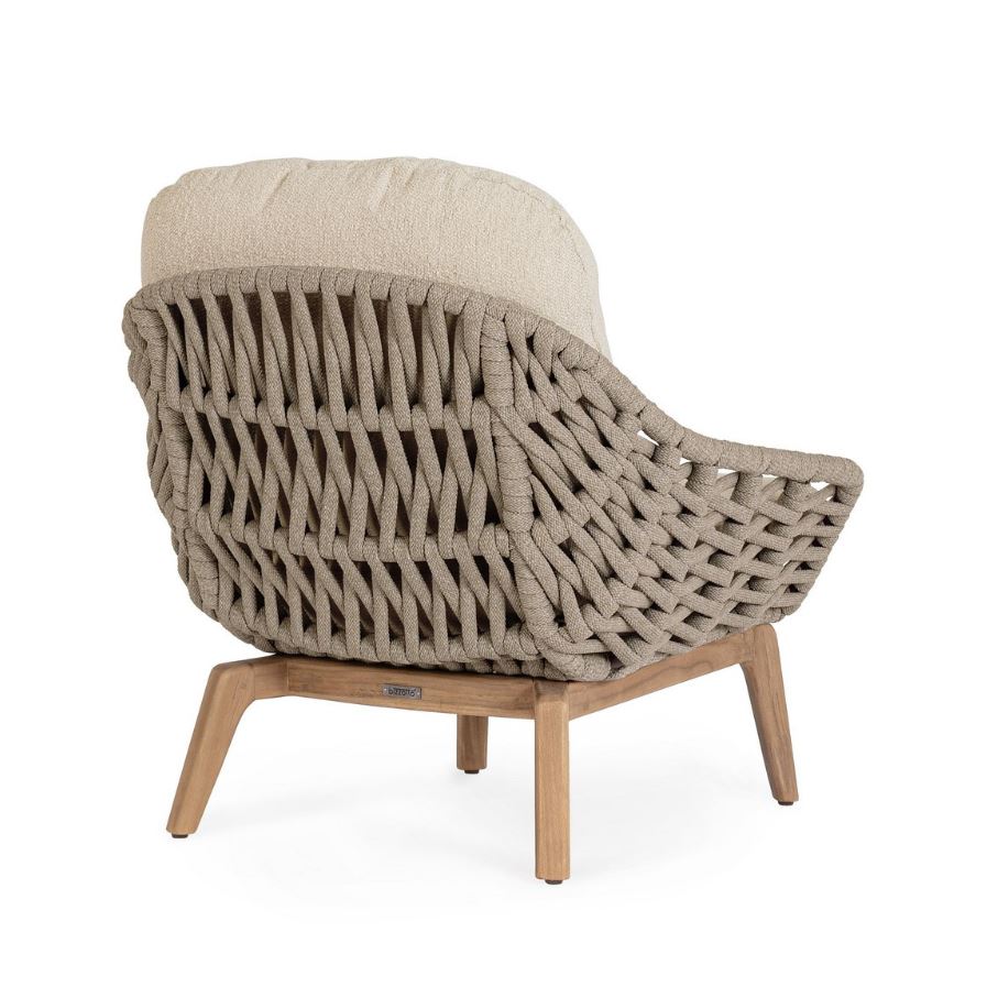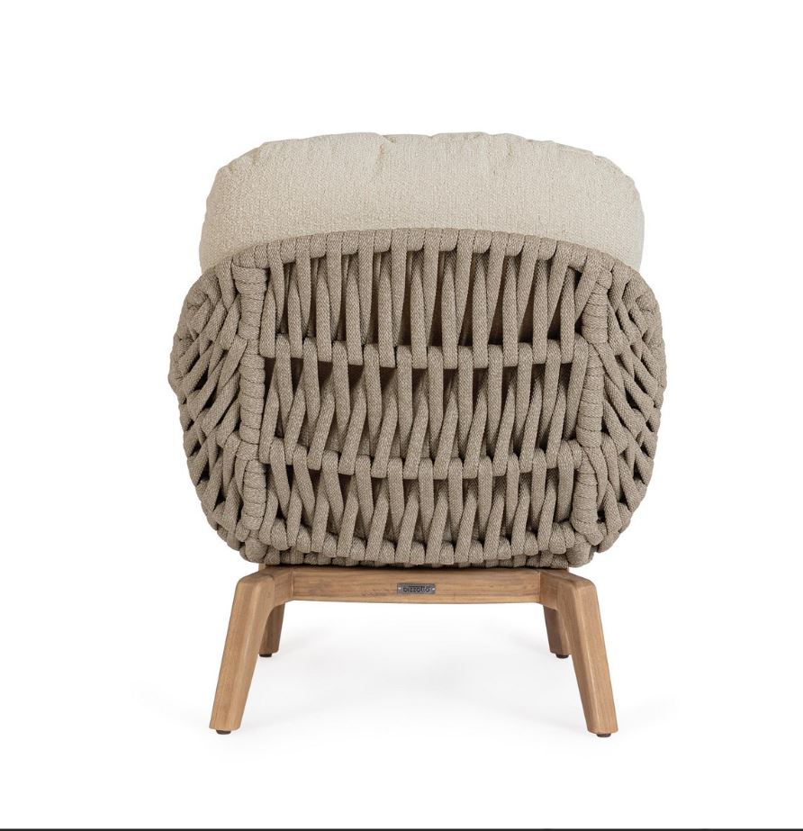 L’elegante intreccio in corda avvolge la poltrona con un effetto visivo ricercato, offrendo comfort e traspirabilità e richiamando uno stile outdoor sofisticato e accogliente. A completare il design, i cuscini sfoderabili effetto bouclé donano una sensazione di morbidezza e relax, oltre a garantire praticità nella manutenzione quotidiana. La particolare texture del rivestimento esalta l’estetica della poltrona, rendendola perfetta per chi desidera un arredo esterno che unisca funzionalità ed eleganza.