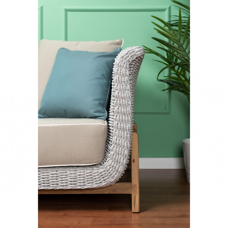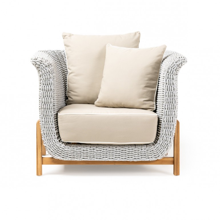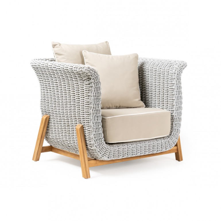 Poltrona Zante , è realizzata con base in teak massiccio e intreccio manuale in corda Viro Rope HDPE di altissima qualità. Il telaio interno è è in alluminio verniciato a polvere epossidica.