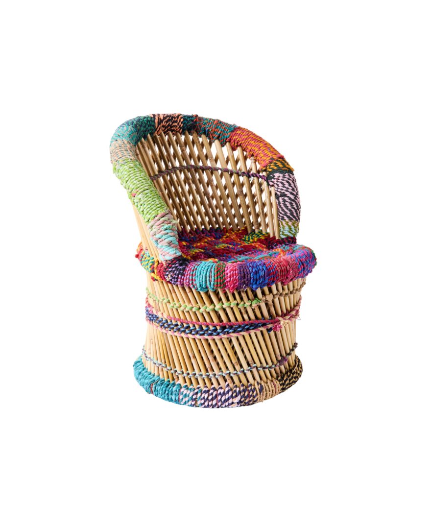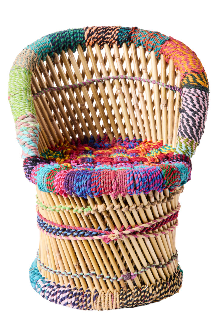 Porta calore e personalità nei tuoi ambienti con questa poltroncina realizzata in bambù e rivestita in corda e cotone colorata, una perfetta combinazione di materiali naturali e design contemporaneo
