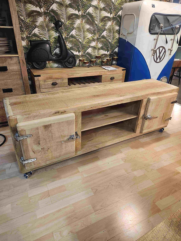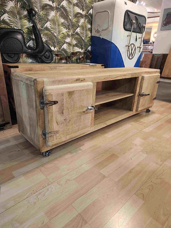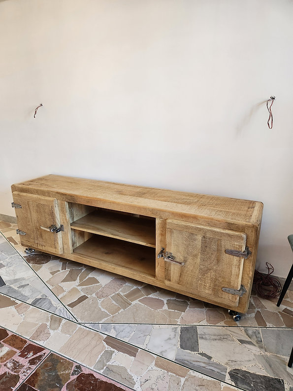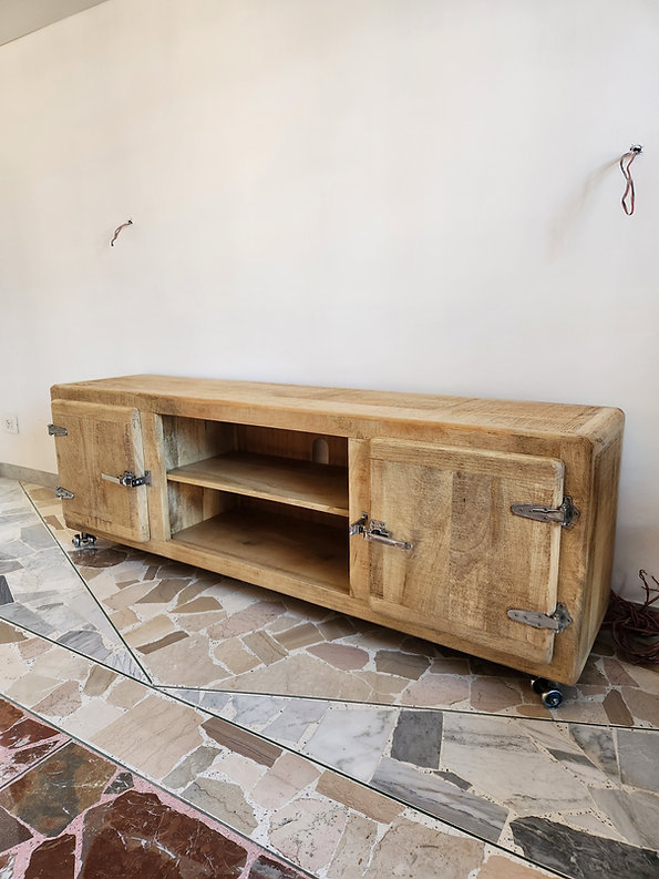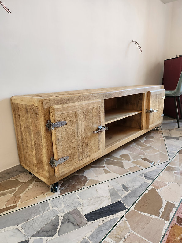 Porta TV Freeze 180, prodotto artigianale in vero legno massello lavorato a mano e dettagli in metallo cromato.