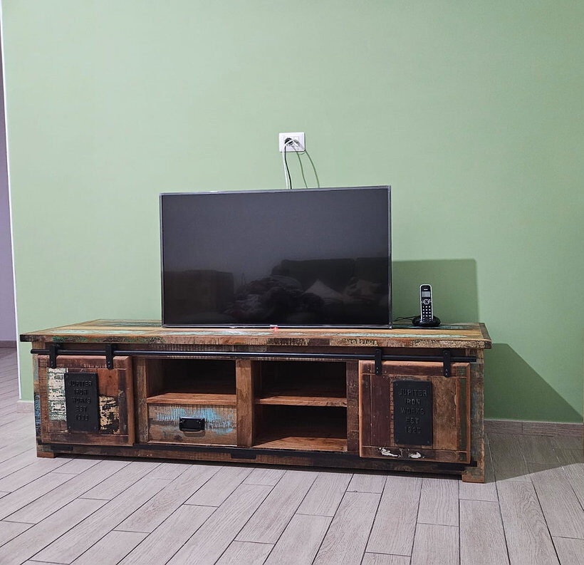 Porta tv Jupiter Riciclo 180, con ante scorrevoli e cassetto. Finitura legno riciclato colorato.
