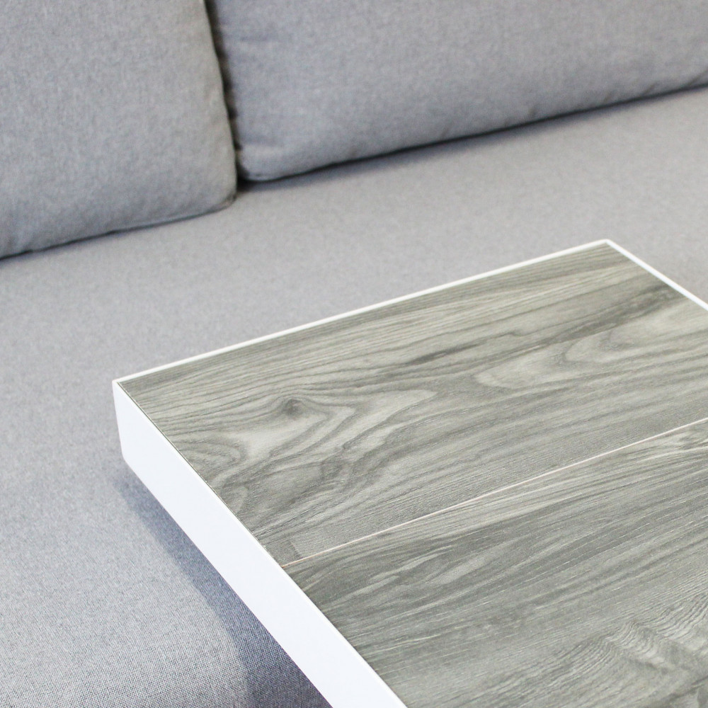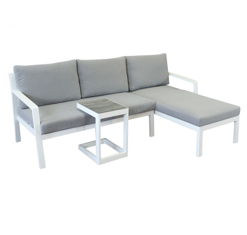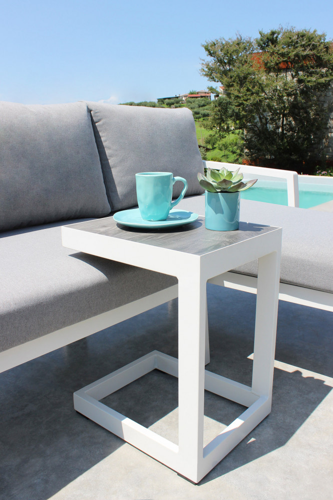 Questo set per giardino è stato concepito con materiali resistenti e adatti all’esterno, la struttura è in alluminio verniciato di colore bianco.