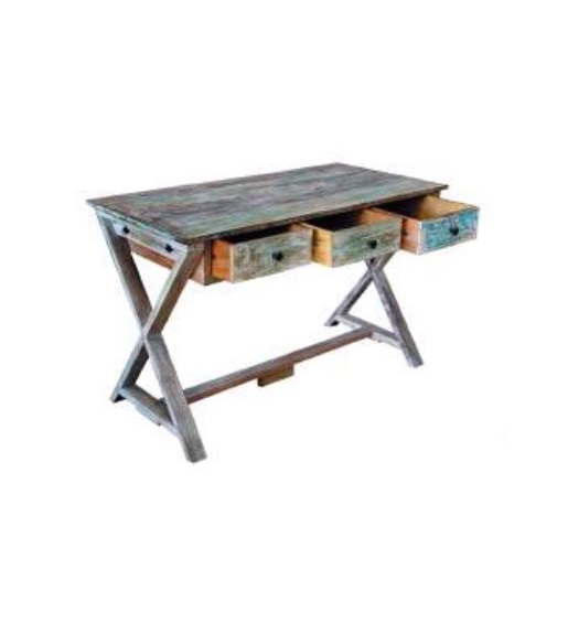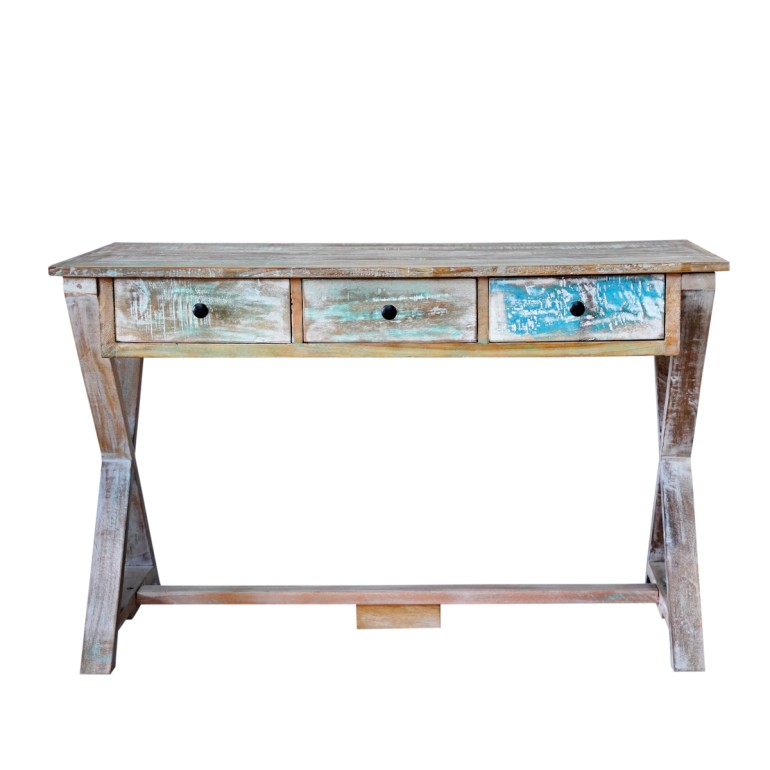 La caratteristica distintiva della Raphael è la sua vivace finitura multicolor, ottenuta recuperando legni che conservano tracce delle loro colorazioni originali, accostate in un mosaico materico di grande impatto visivo. Sotto il piano di lavoro, i tre cassetti offrono una soluzione pratica e capiente per organizzare cancelleria, documenti e dispositivi, mantenendo la superficie libera e ordinata.