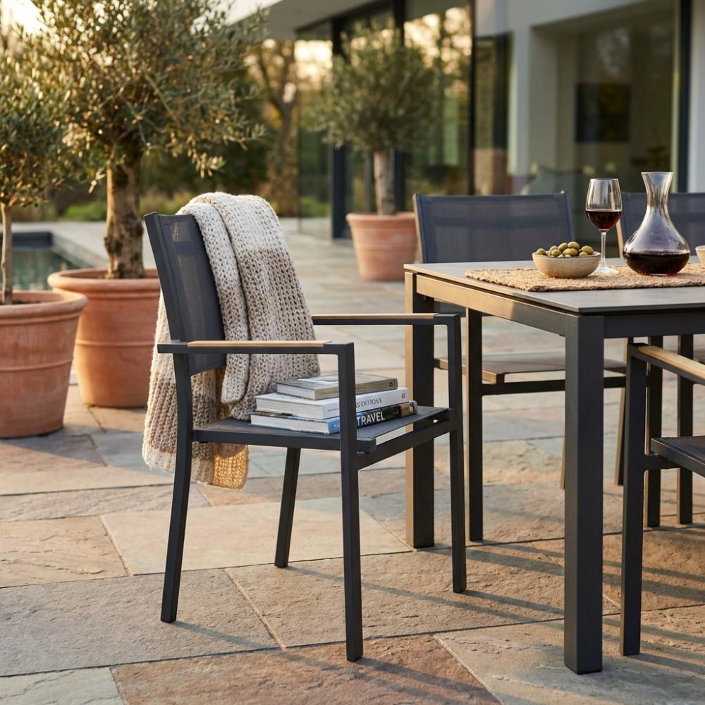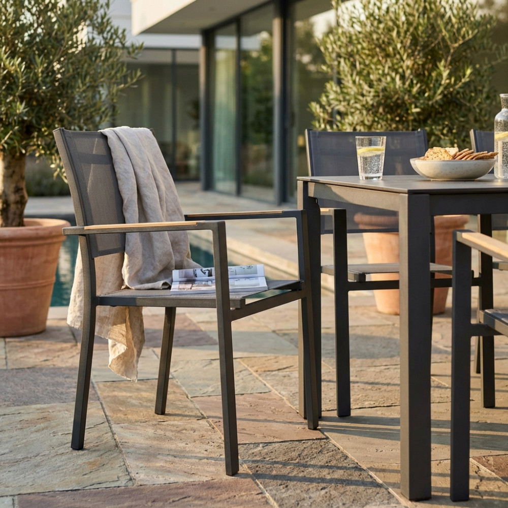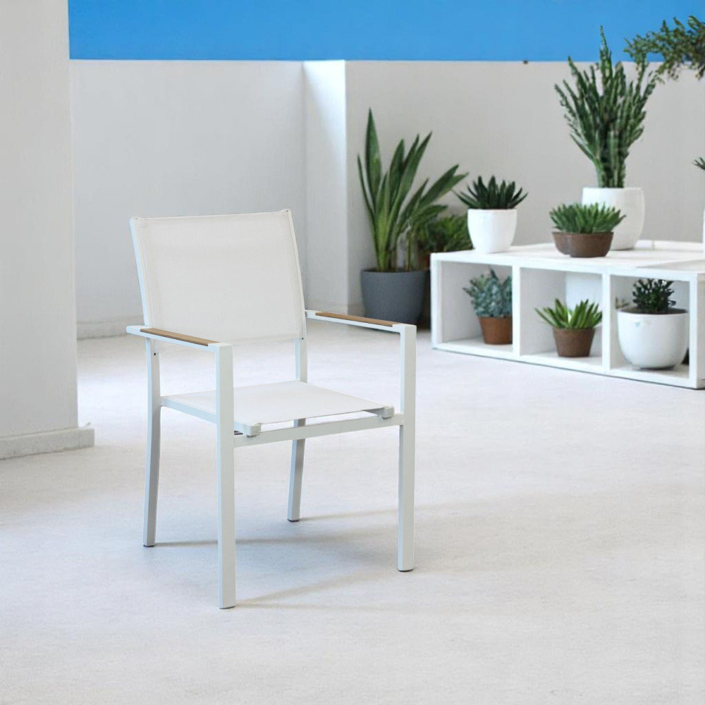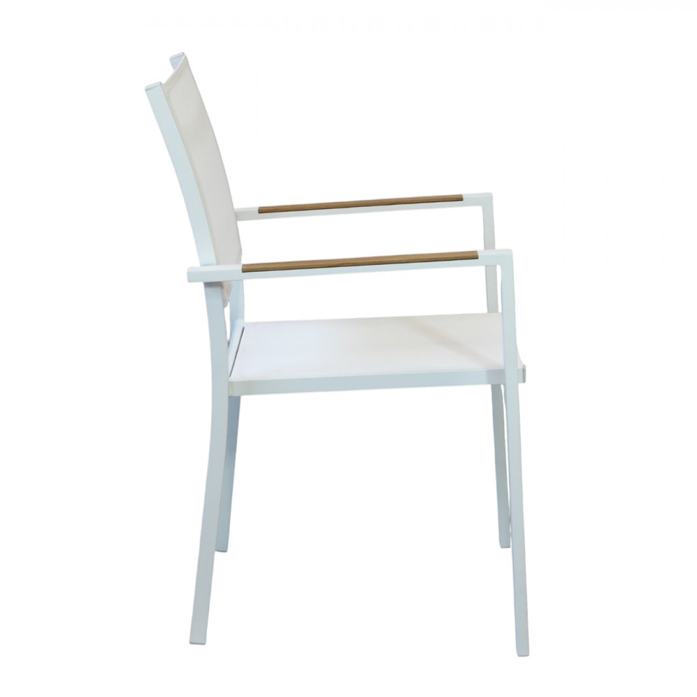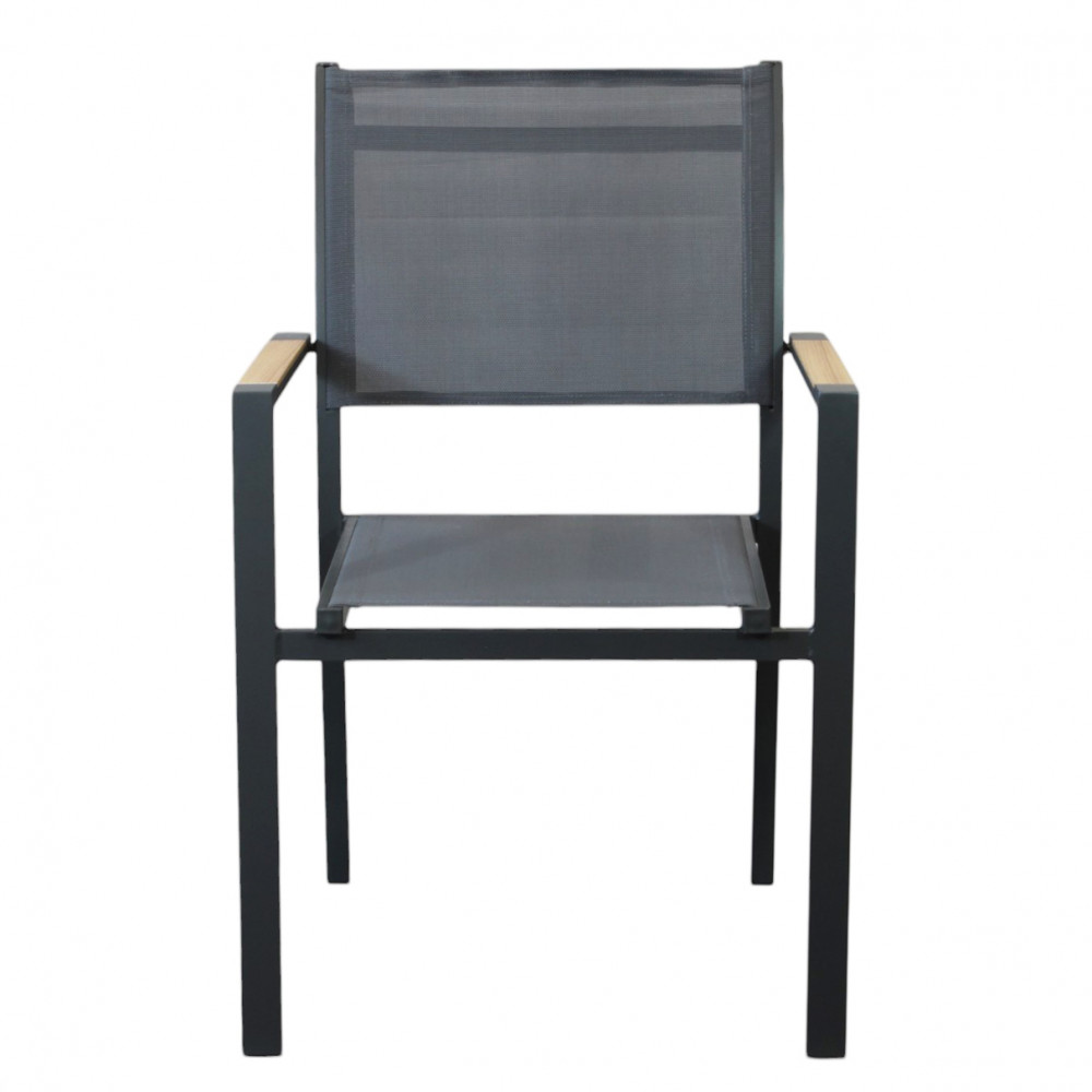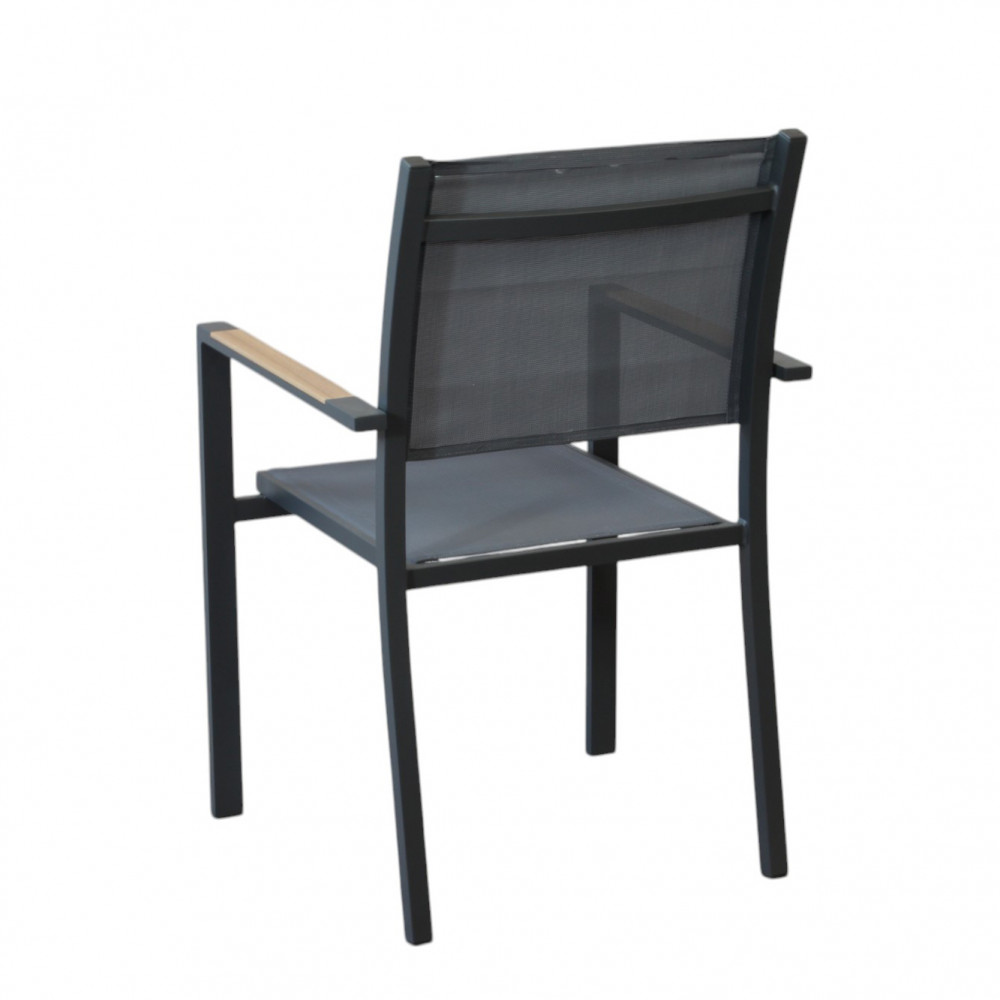 Sedia C-br Brooklyn, struttura in alluminio, seduta e schienale in textilene, braccioli effetto legno.