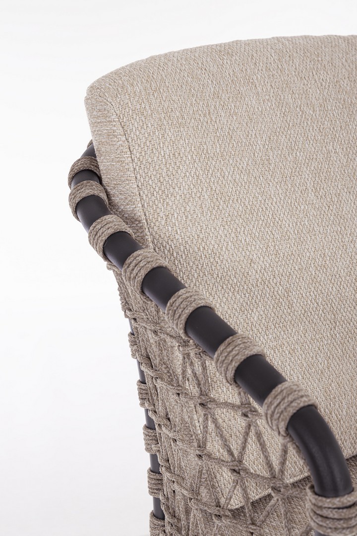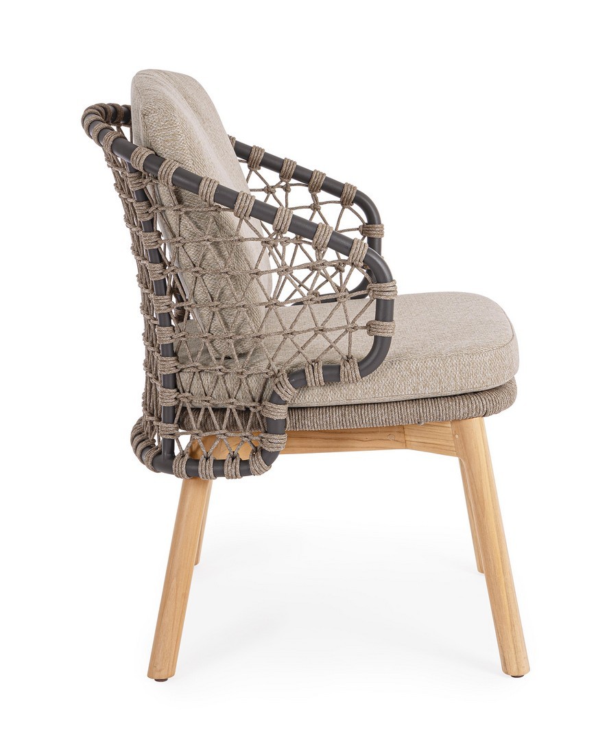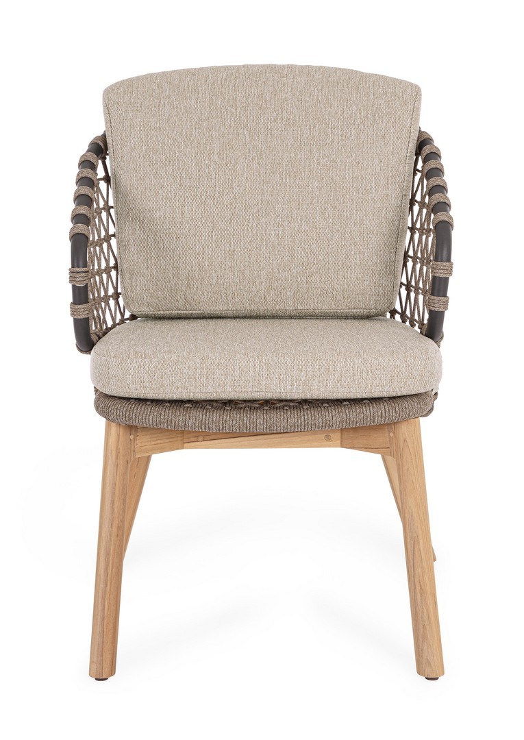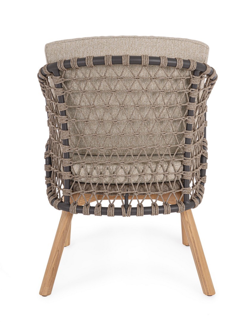 Sedia C-Br Eularia , Seduta con struttura in alluminio verniciata a polvere (poliestere). L’intreccio è per esterno in corda, polipropilene.. Il cuscino della seduta è sfoderabile con tessuto sunproof olefin (100% polipropilene). Le gambe sono in legno di teak (legno certificato proveniente da foreste sostenibili). Gambe da assemblare.