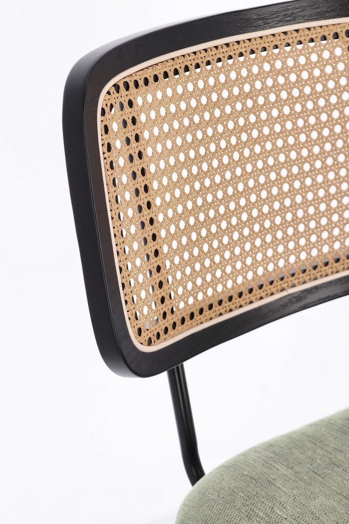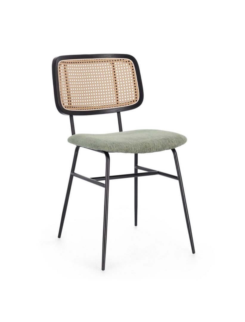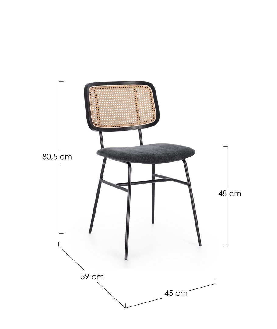 Sedia Glenna, struttura in acciaio verniciato a polvere epossidica. La seduta è in compensato con rivestimento in 100 % poliestere. Lo schienale è in compensato con lavorazione in fibra sintetica effetto rattan.