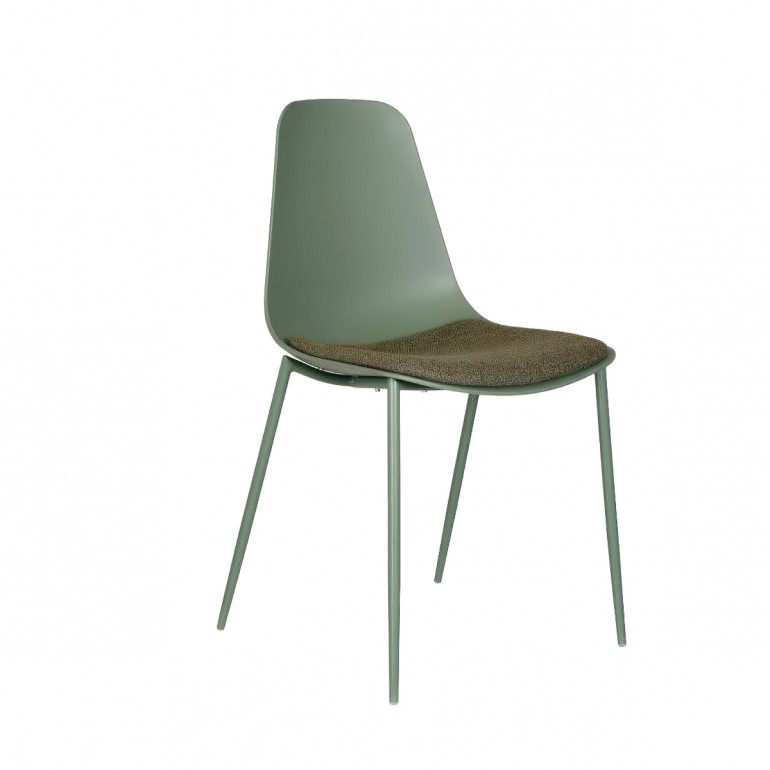 Sedia Inès, sedia in polipropilene colore verde e seduta in stoffa simil cotone a trama larga.