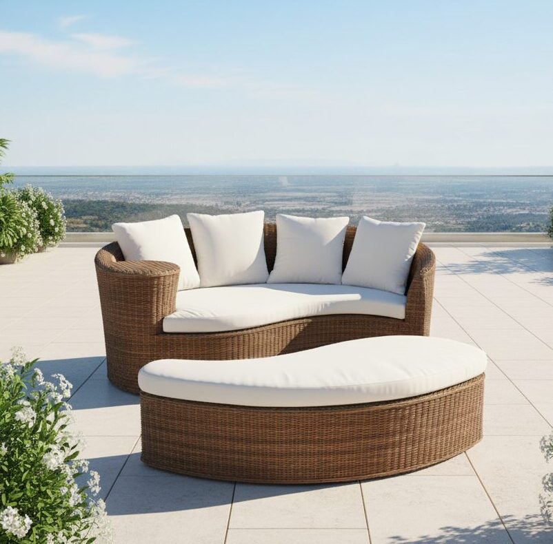 L’intreccio raffinato, unito alla qualità dei materiali e al design deciso, rende questo arredo adatto sia per ambienti interni che esterni. Si integra perfettamente in contesti residenziali e contract, come giardini, terrazze, verande o aree piscina.