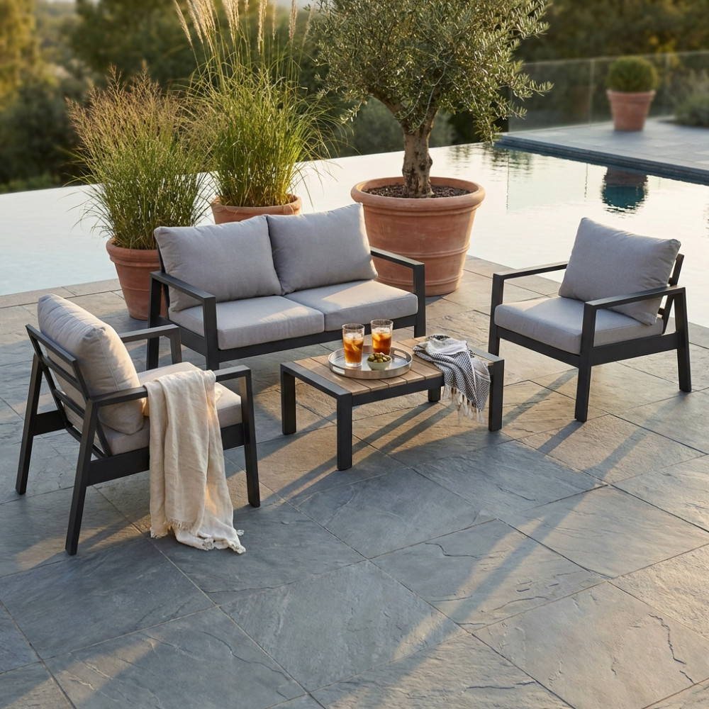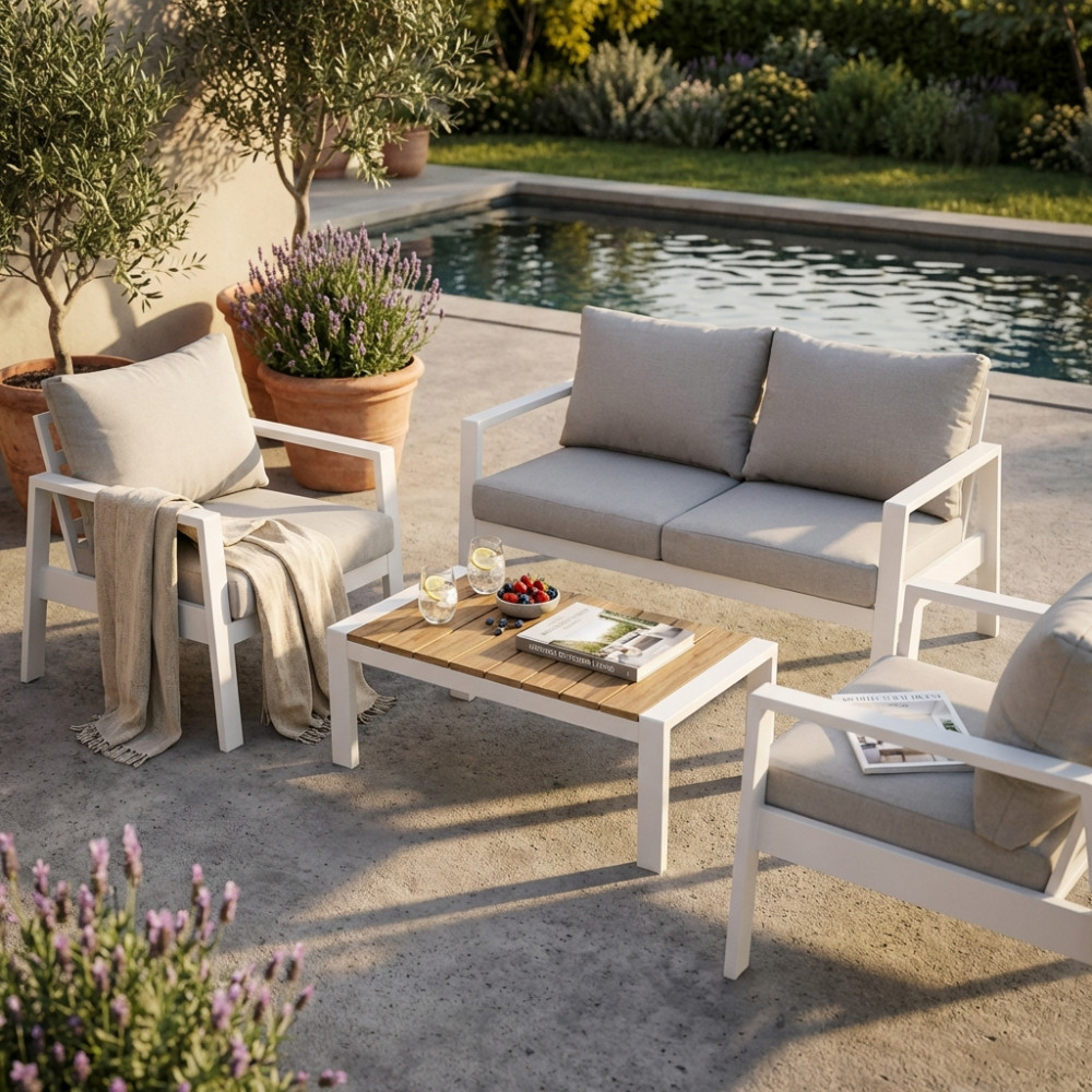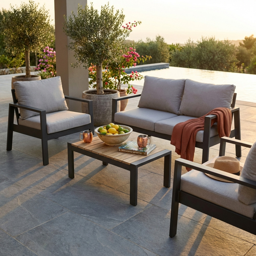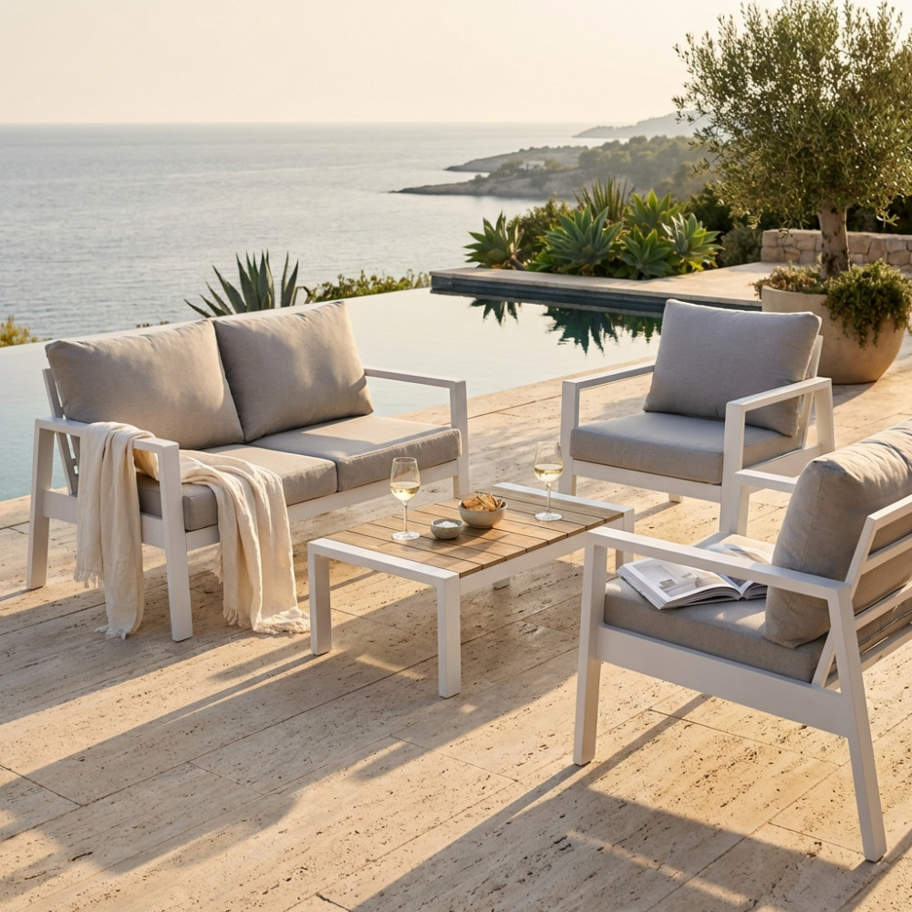 Questo set da esterno è la scelta ideale per chi vuole arredare gli spazi all’aperto con stile, senza rinunciare alla comodità. Caratterizzato da una struttura in alluminio dal design essenziale e contemporaneo, combina leggerezza e solidità, adattandosi perfettamente a verande, terrazze e giardini moderni.