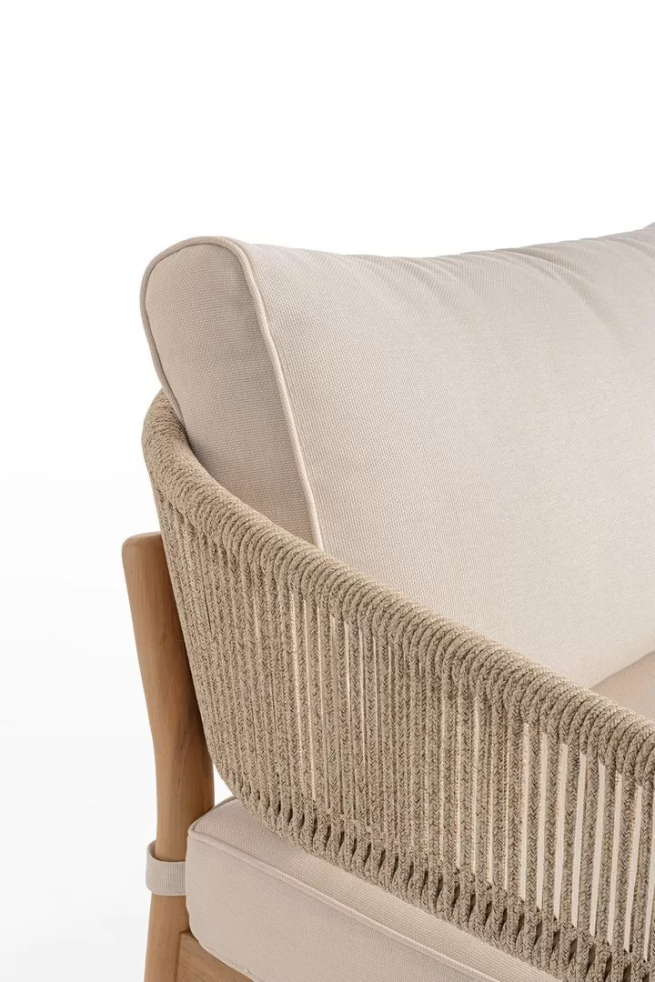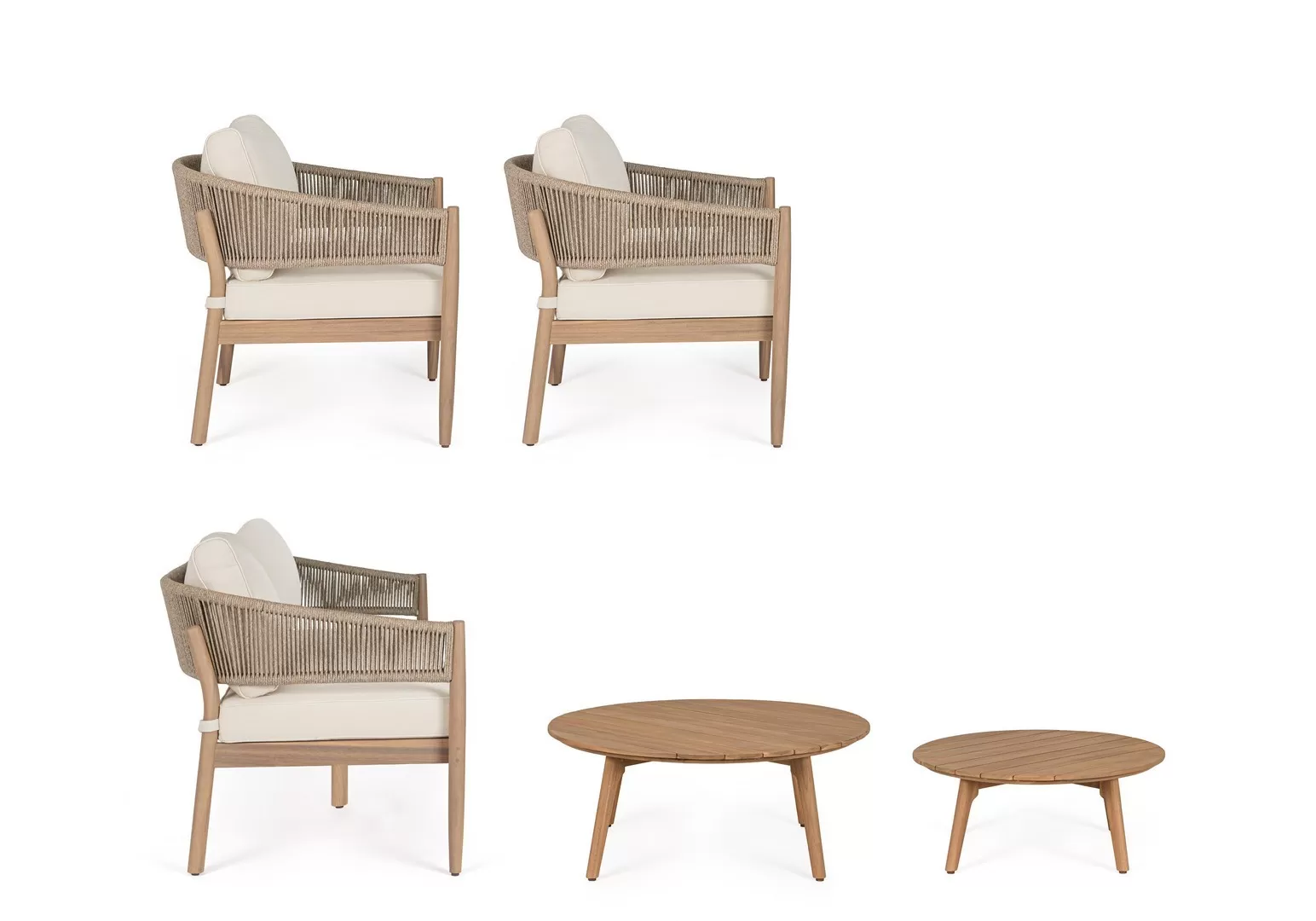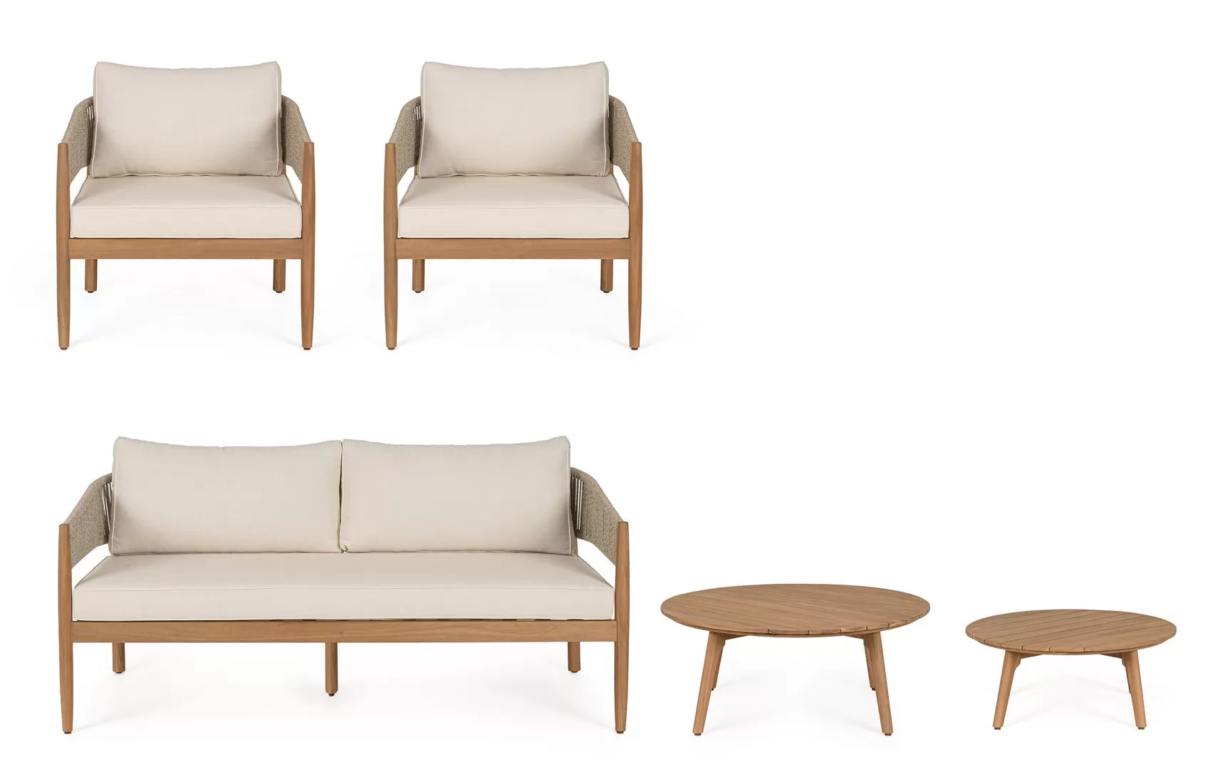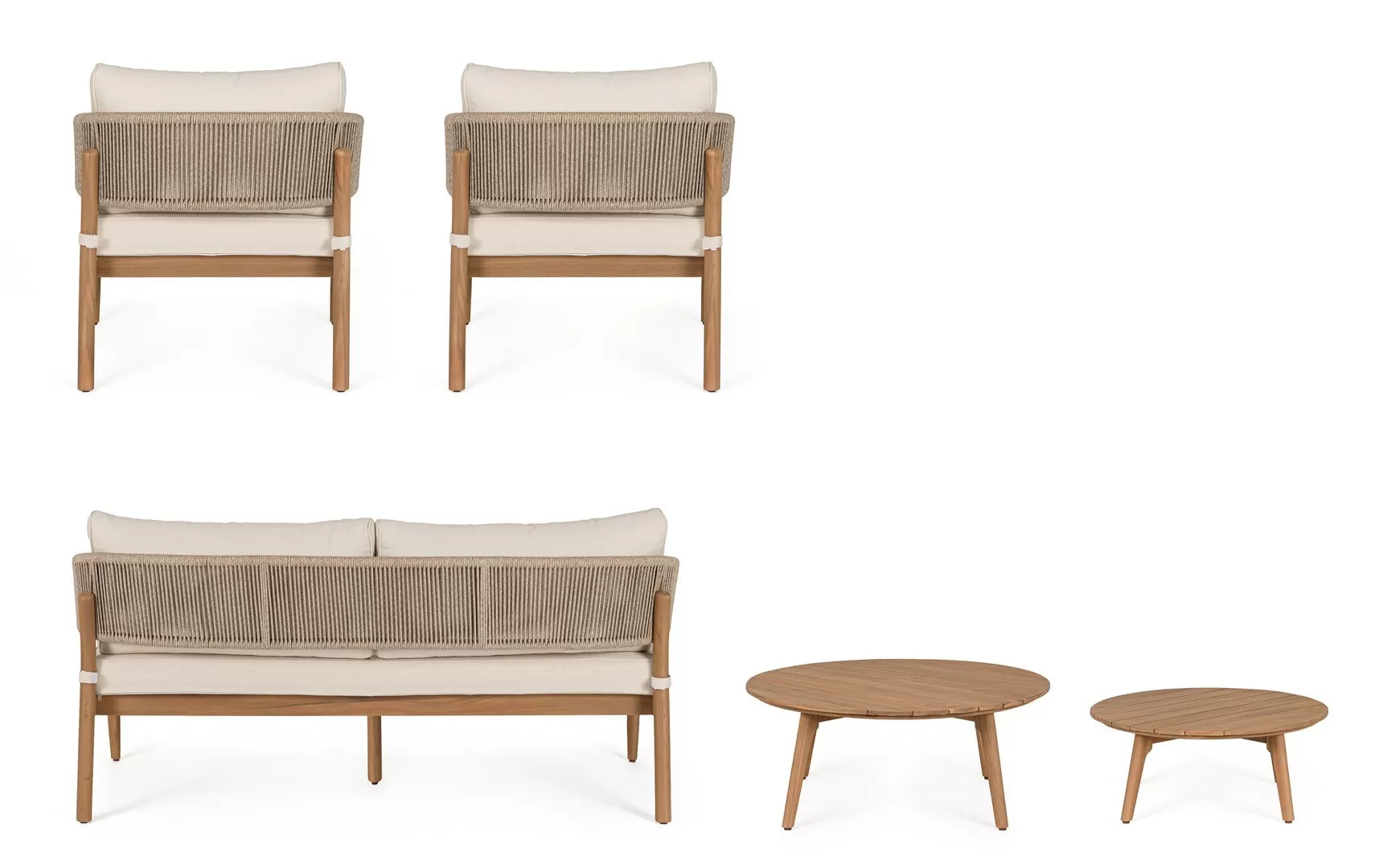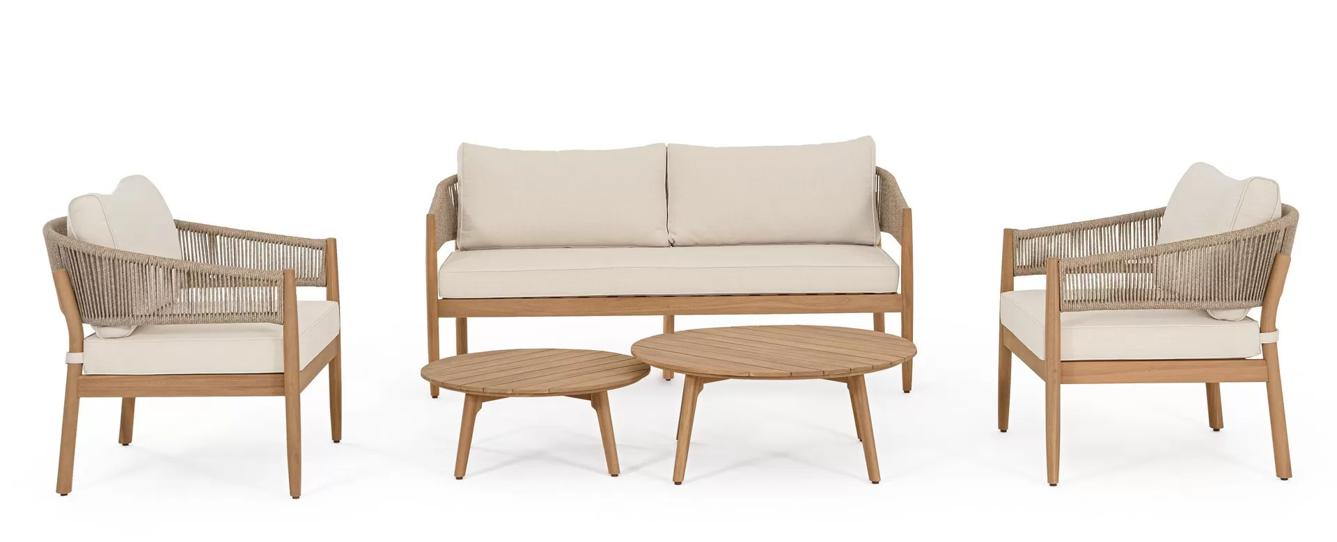 Il salotto da giardino Thiago rappresenta un’innovativa fusione materica, ideale per chi cerca un arredamento outdoor che sia al tempo stesso caldo, moderno e altamente tecnologico. La base del set è realizzata in pregiato legno di acacia con una raffinata finitura a olio effetto teak, che conferisce all’intera struttura un aspetto organico e una resistenza naturale superiore. A contrasto con la solidità del legno, il design si evolve in uno schienale in alluminio leggero ma robusto, arricchito da un sofisticato intreccio in corda che dona un tocco di leggerezza visiva e un’estetica dal sapore artigianale e contemporaneo.
