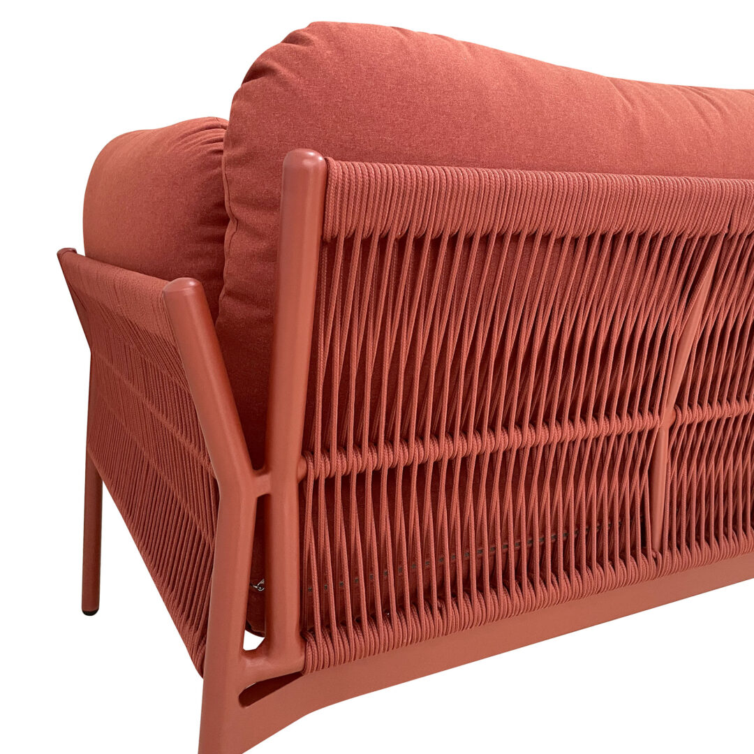 Lo schienale, realizzato in corda di PVC intrecciata, garantisce un sostegno ottimale senza appesantire la linea complessiva del set, donando leggerezza e modernità al design. Tutti i cuscini sono sfoderabili e lavabili, per una manutenzione semplice e veloce.
