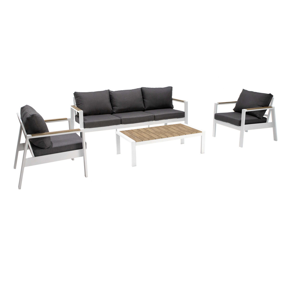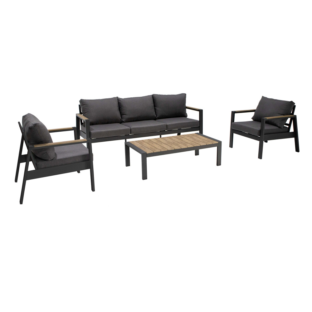 Le sedute ampie, dotate di morbidi cuscini sia sulla base che sullo schienale, offrono un comfort elevato per godersi appieno i momenti di relax all’aria aperta. I braccioli delle poltrone e il piano del tavolino sono rifiniti in polywood effetto legno, un materiale pratico e resistente che richiama l’eleganza del legno naturale senza necessità di manutenzione.