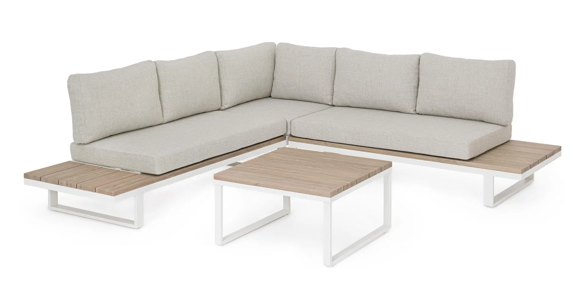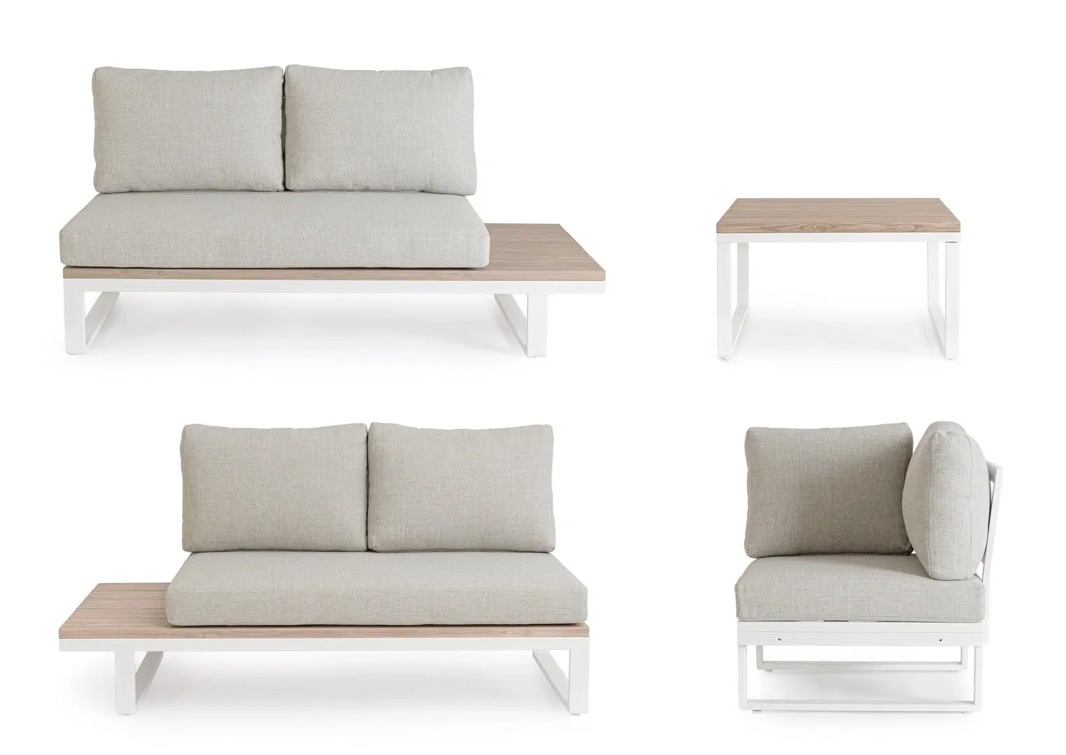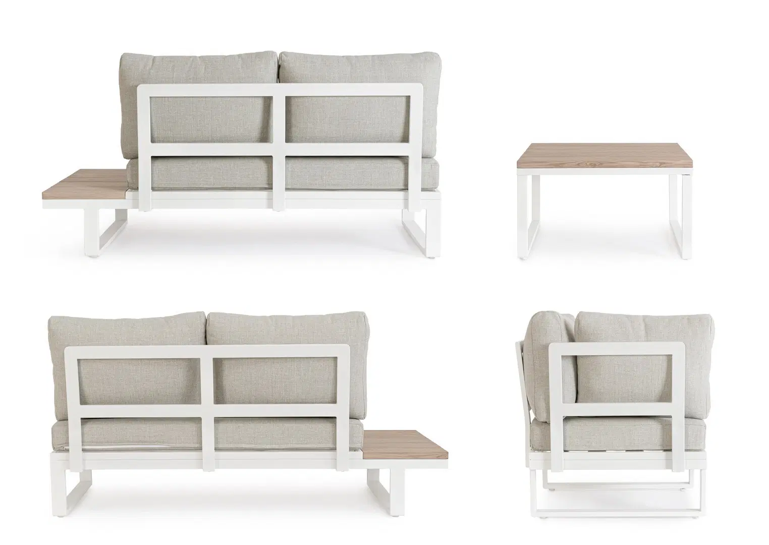 Struttura in alluminio verniciata a polvere (poliestere). Laterali del divano e il piano del tavolino sono in alluminio con verniciatura effetto legno. I cuscini della seduta e dello schienale sono sfoderabili con tessuto idrorepellente olefin (100% polipropilene).