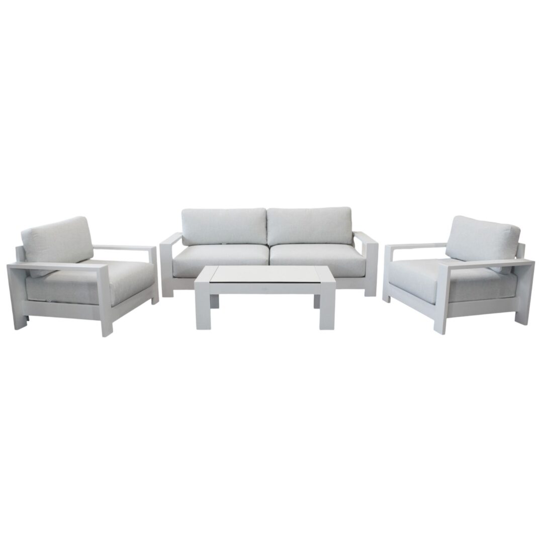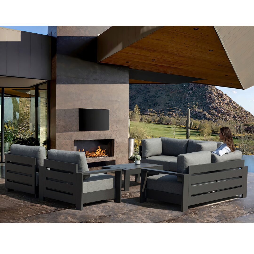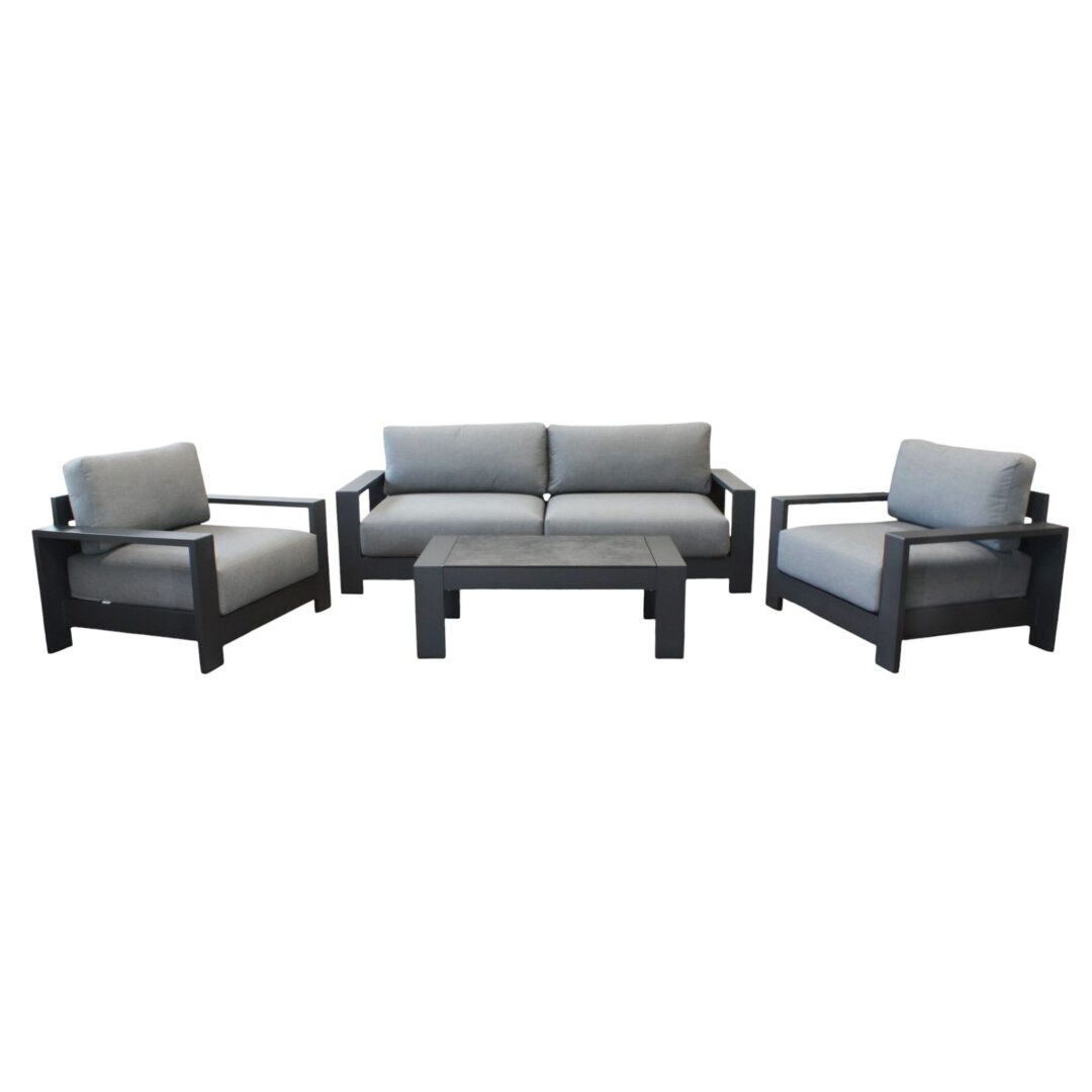Salotto da esterno dal design moderno e linee decise, con struttura in alluminio verniciato a polvere e cuscini sfoderabili in tessuto impermeabile. Confortevole, resistente e raffinato, è ideale per arredare terrazze, giardini o verande con stile e funzionalità. Il tavolino con piano in HPL effetto cemento completa il set, offrendo durabilità e un tocco contemporaneo.