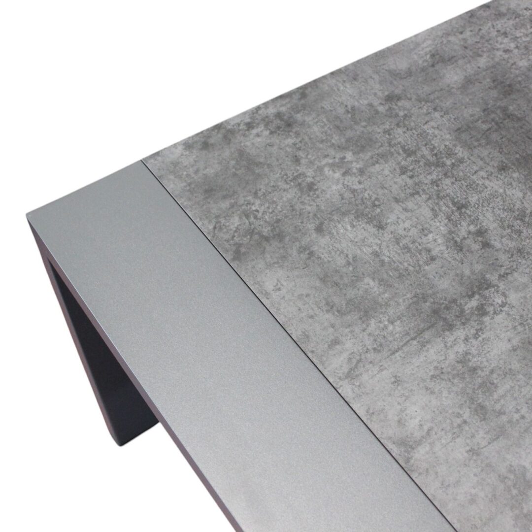 Il tavolino coordinato, con piano in HPL effetto cemento, aggiunge un tocco sofisticato e funzionale: resiste alle intemperie, al calore e all’usura, mantenendo intatto il suo aspetto elegante.