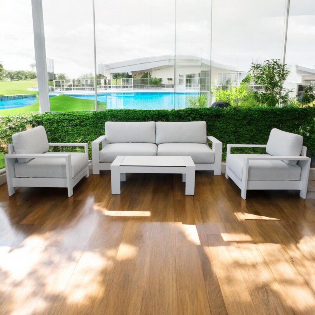 Eleganza solida e comfort all’aperto: questo salotto da esterno unisce resistenza, stile moderno e comodità. La struttura in alluminio a spessore, trattata con verniciatura a polvere, è progettata per durare nel tempo offrendo al contempo un’estetica essenziale e attuale. Le forme nette e geometriche donano personalità, perfette per ambienti outdoor dal gusto contemporaneo e raffinato.