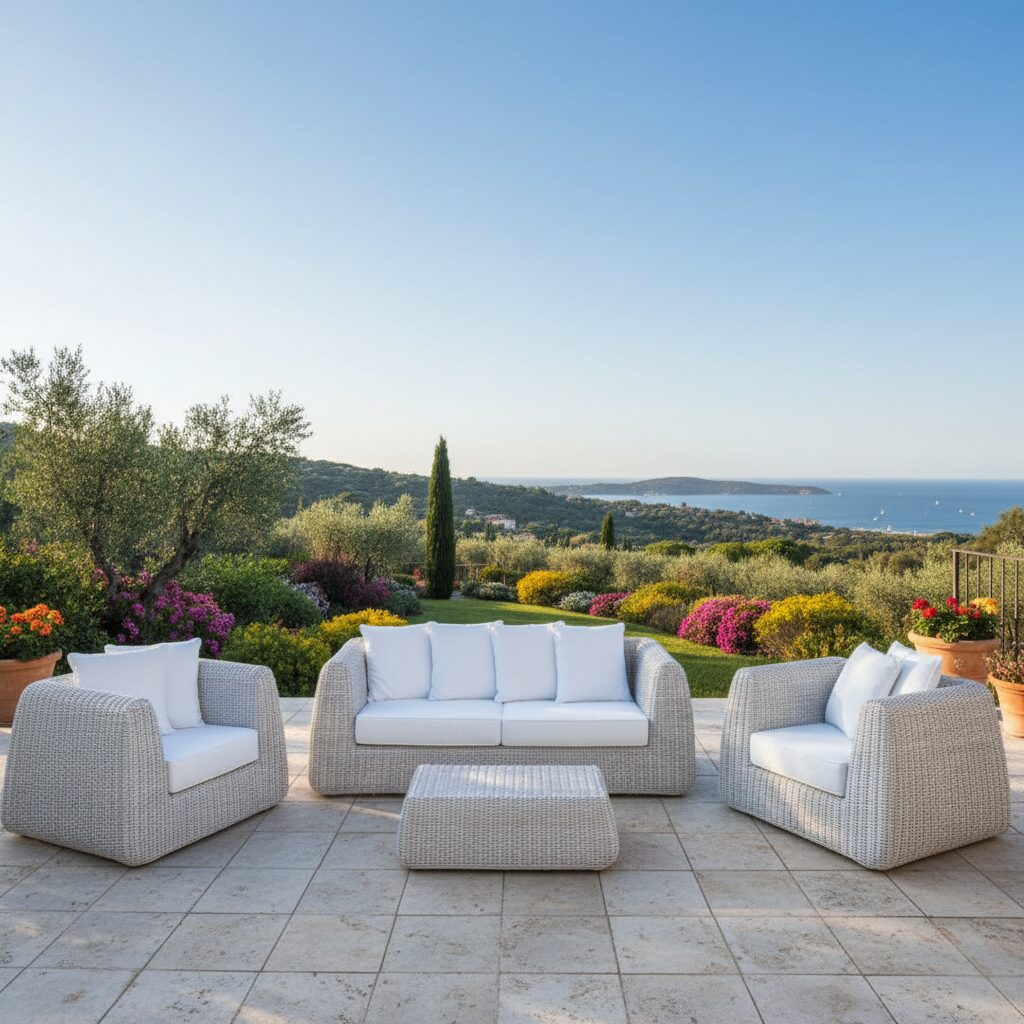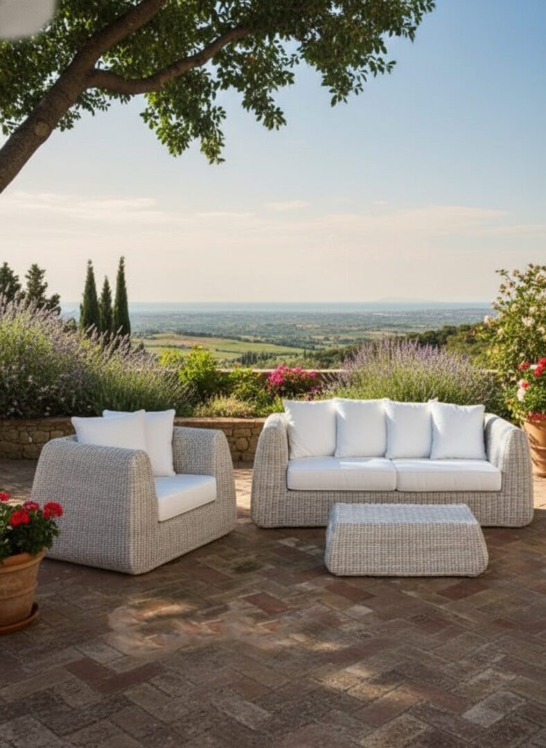 Il polietilene ad alta densità di marca Rehau, intrecciato a mano su telai di alluminio, rende questo set arredo da giardino un prodotto d’arredo di qualità . Le strutture in alluminio sono composte da tubolari elettro-saldati e verniciati a polvere epossidica