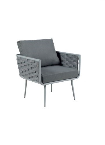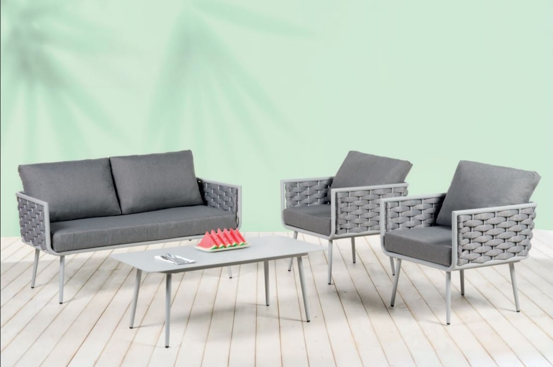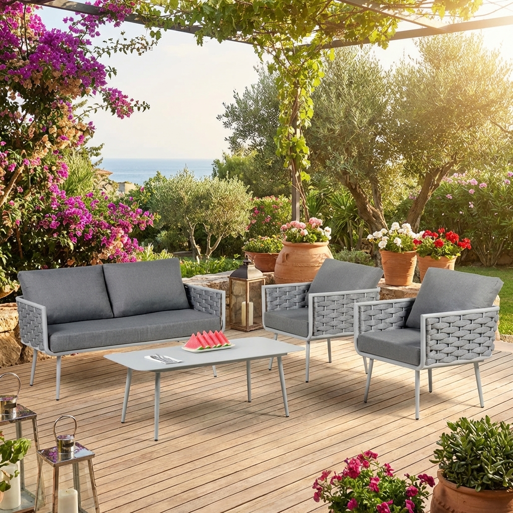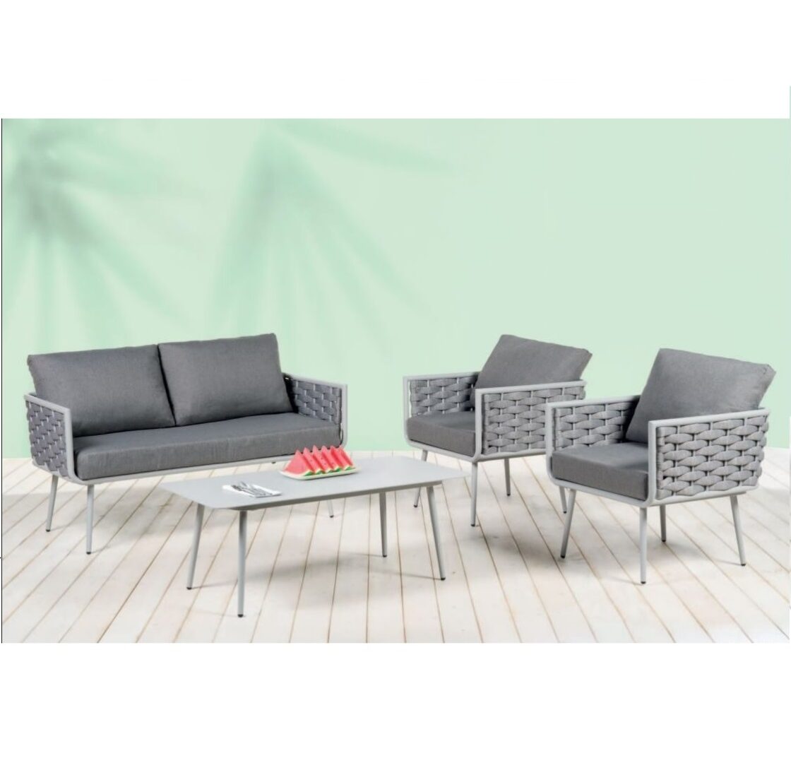 Elegante e moderno, il salotto da esterno in alluminio e corda è pensato per arredare giardini, terrazze e verande con stile e funzionalità. La struttura in alluminio verniciato a polvere garantisce leggerezza, resistenza alla ruggine e durata nel tempo, anche esposto agli agenti atmosferici. L’intreccio in corda, resistente ai raggi UV e all’umidità, offre comfort e un design contemporaneo che si adatta a diversi contesti outdoor.