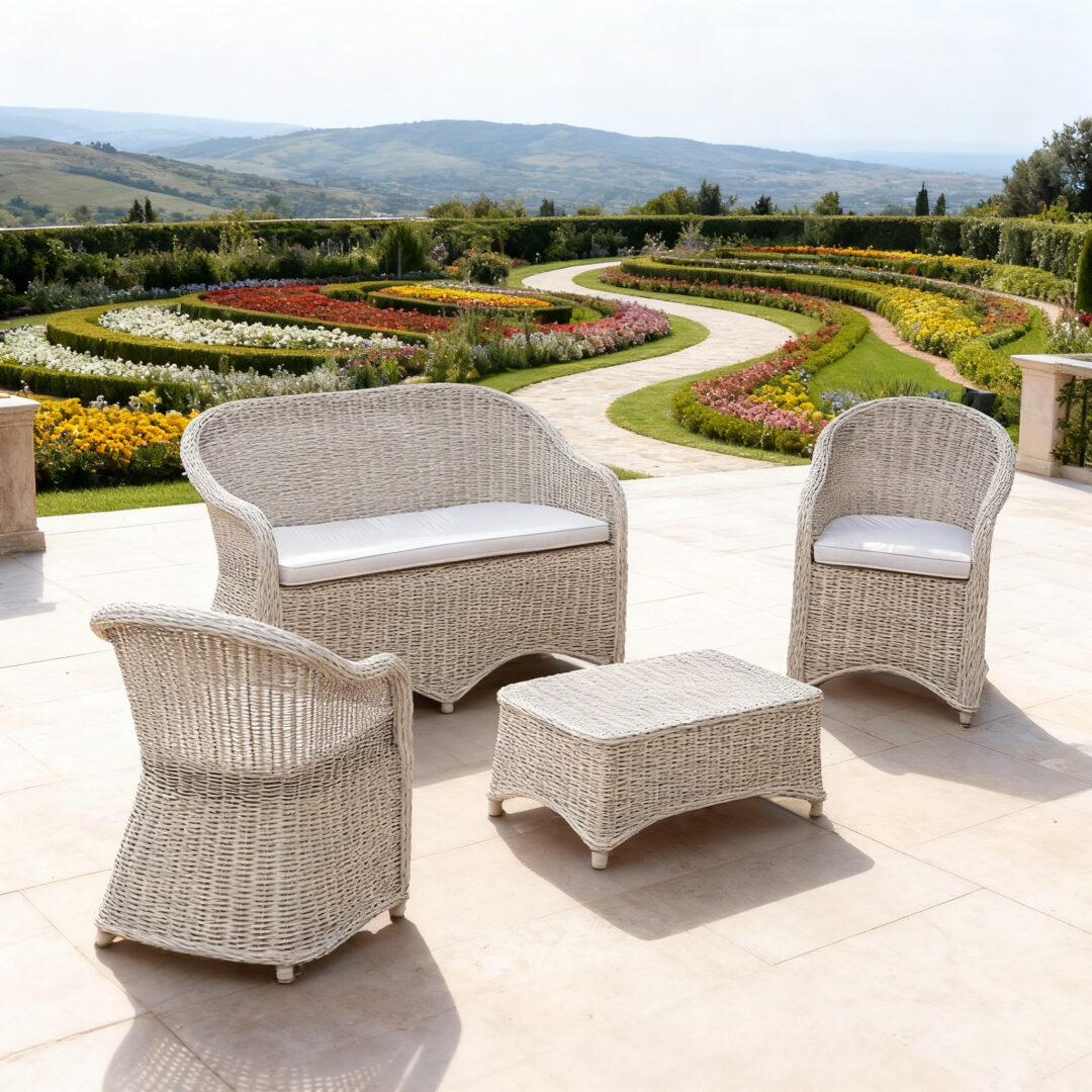 Set Salotto Charlie Rattan Sintetico Bianco, Composto da 2 Poltrone, 1 Divano e 1 Tavolino.